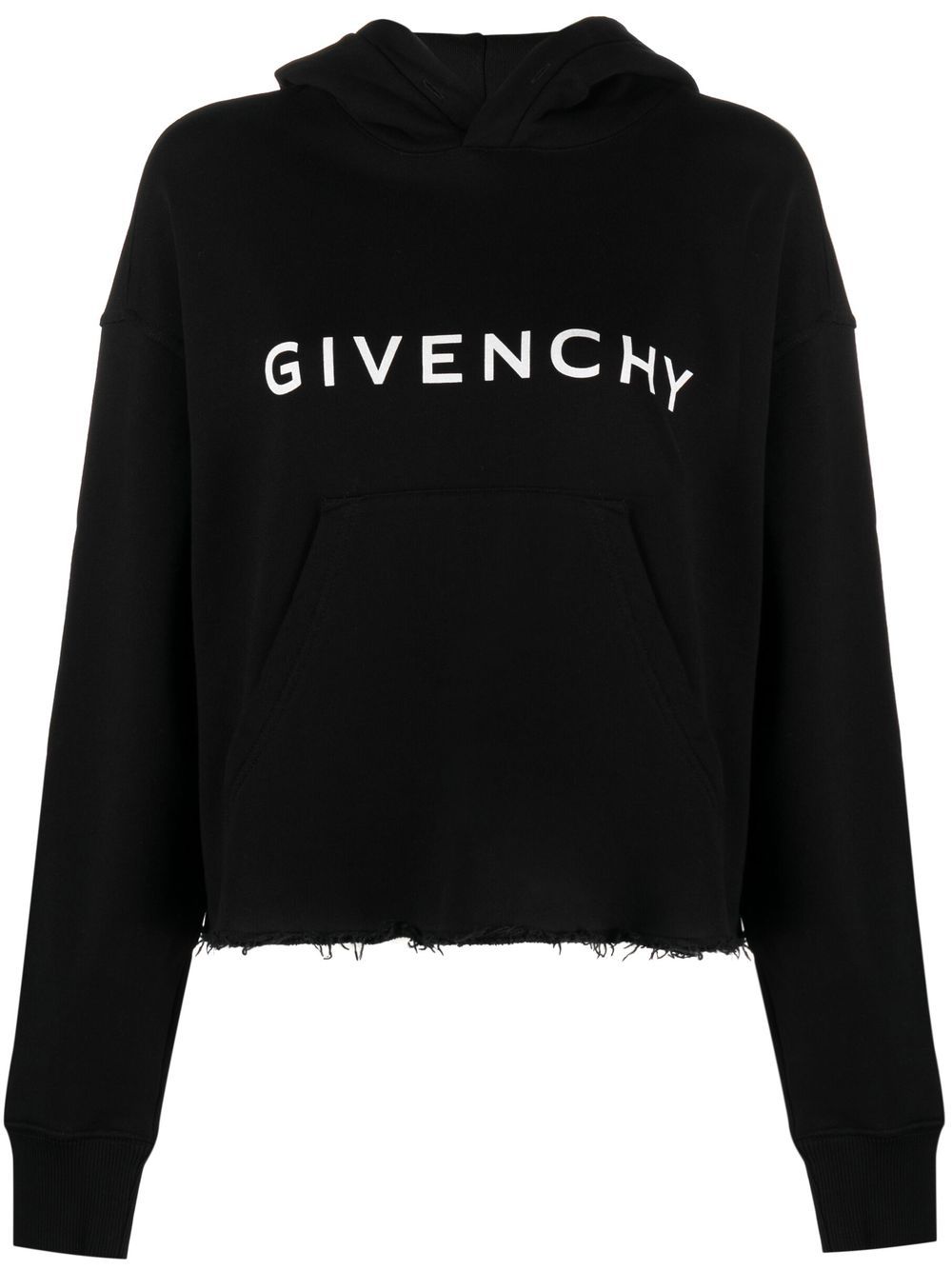 Arquetipo de sudadera con capucha recortada de Givenchy con negro, algodón, estampado del logotipo en la parte delantera, capucha clásica, mangas largas, bolsillo de bolsas delanteras, adornos acanalados y dobladillo recto.