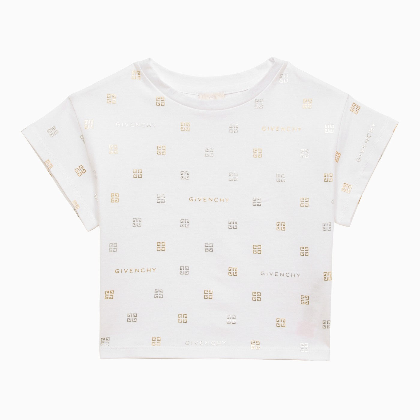 Camiseta de cuello de equipo de algodón blanco con mangas cortas, un logotipo de contraste de plata y oro y un dobladillo recto.