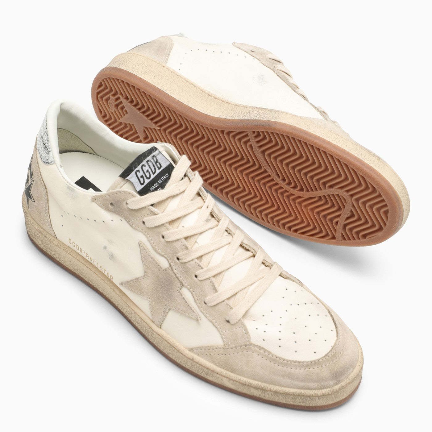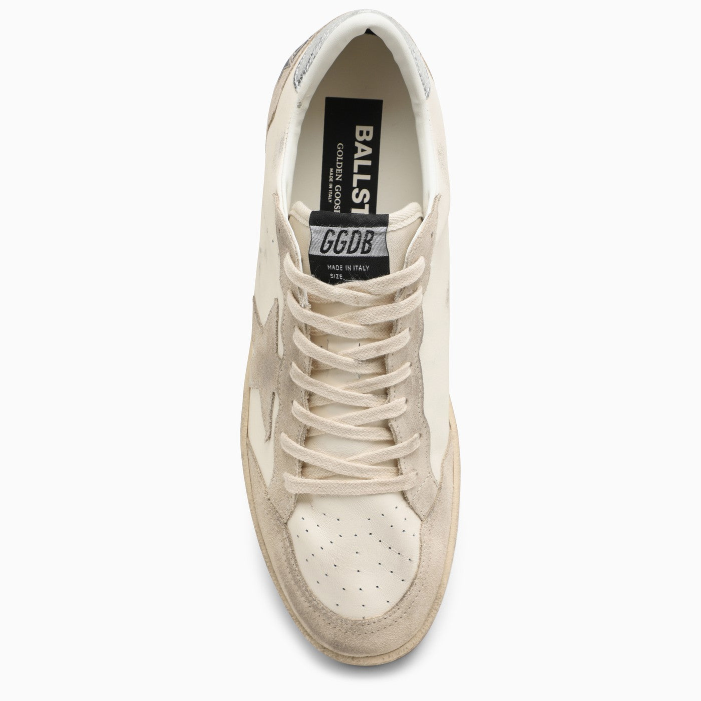 El cuero y la gamuza suave blanca inserta un entrenador bajo de la marca Golden Goose Deluxe con un dedo del pie redondeado y perforado, una estrella lateral icónica, una fijación de cordones, una suela de goma y un tacón trasero plateado. Modelo con mano de obra de efecto vintage.