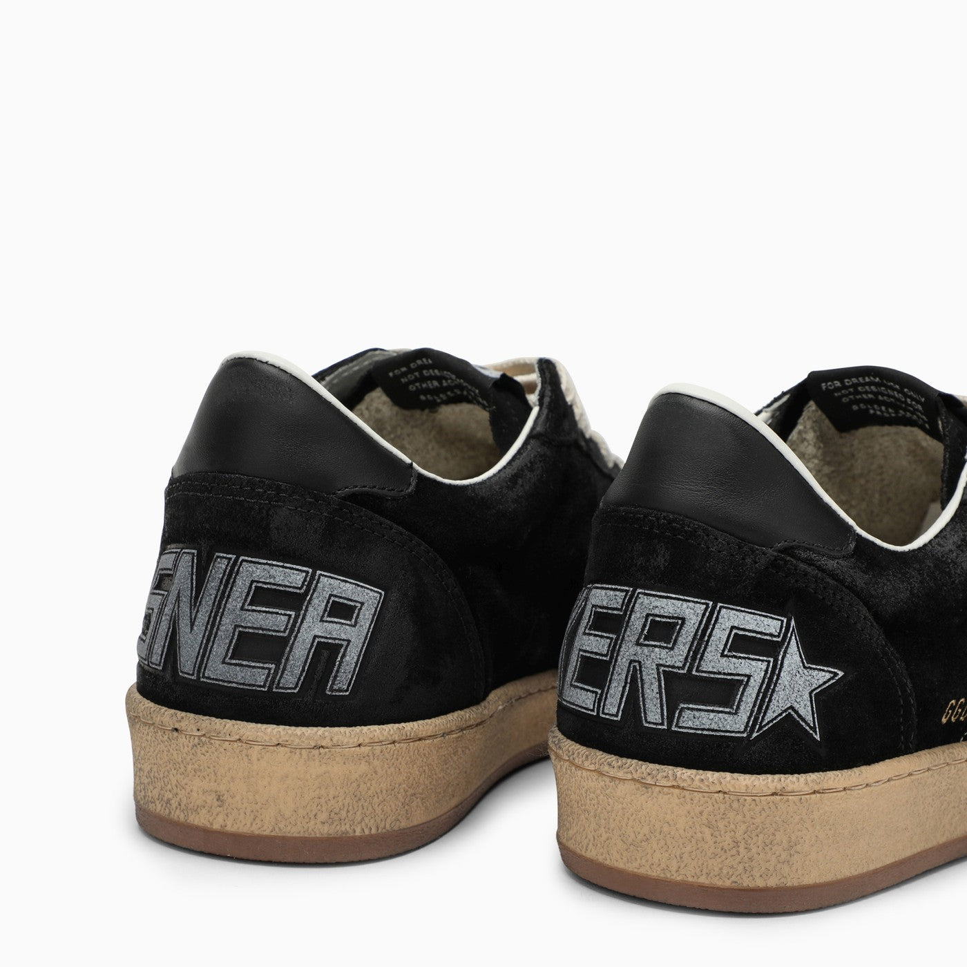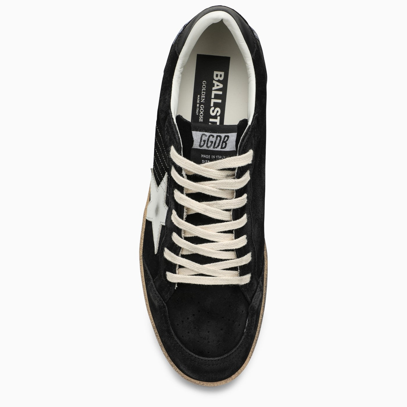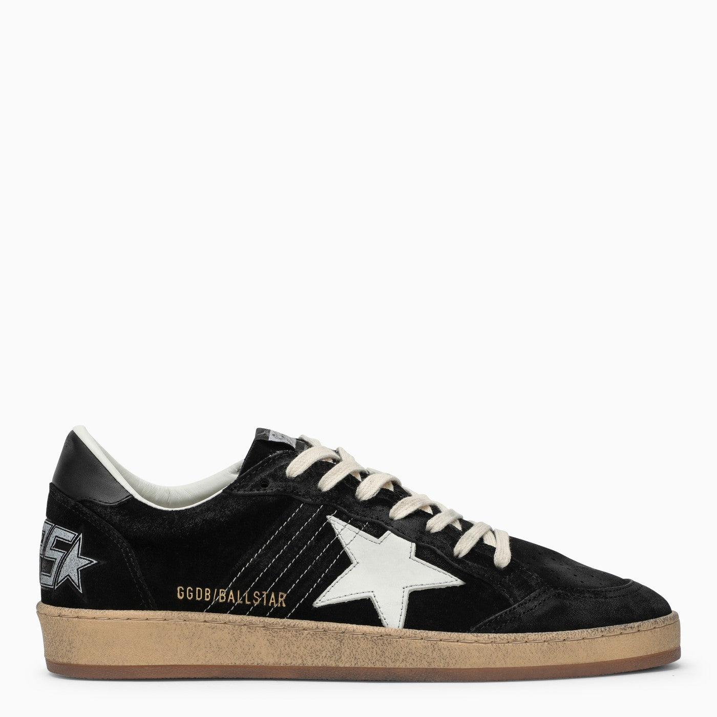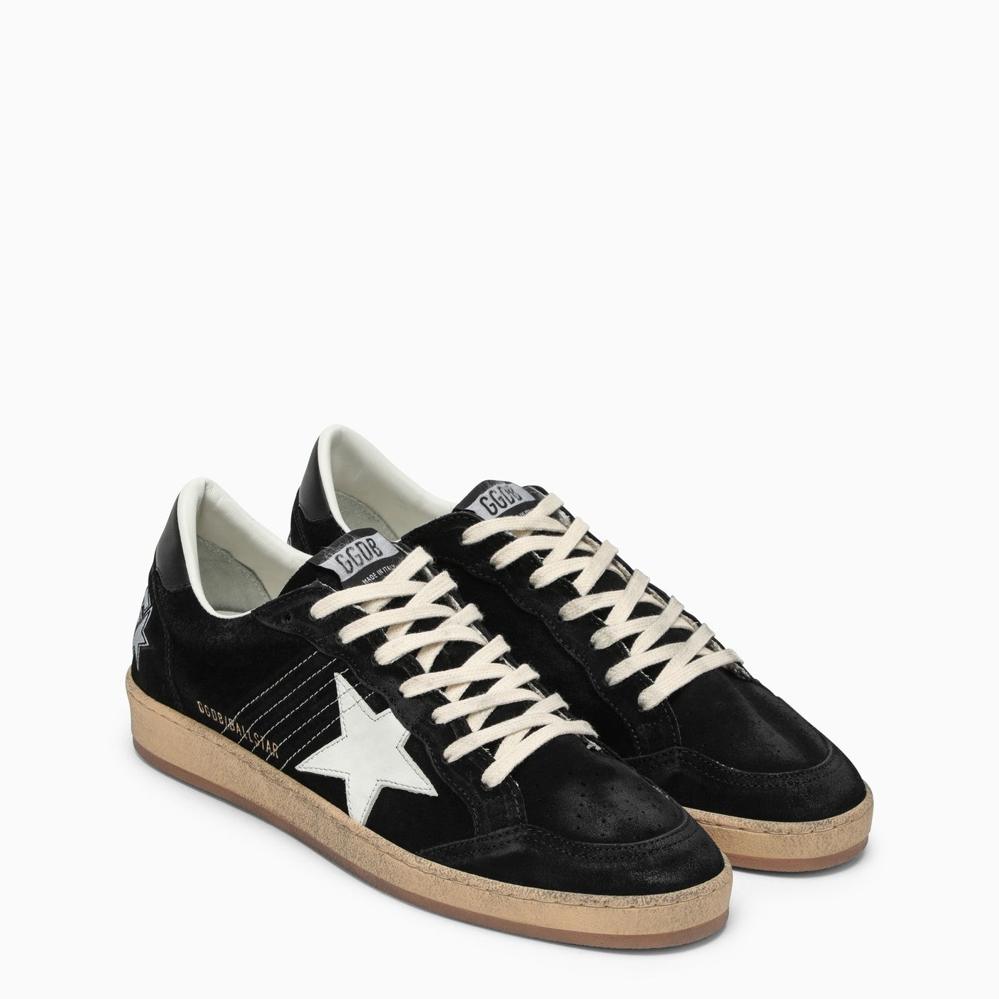 La zapatilla de deporte de cuero de gamuza negro de la marca Golden Goose Deluxe con detalles blancos, dedo del pie redondo perforado, cierre de cordones, estrellas icónicas cosidas en un lado, pestaña del logotipo cosido y mano de obra de efectos vintage.