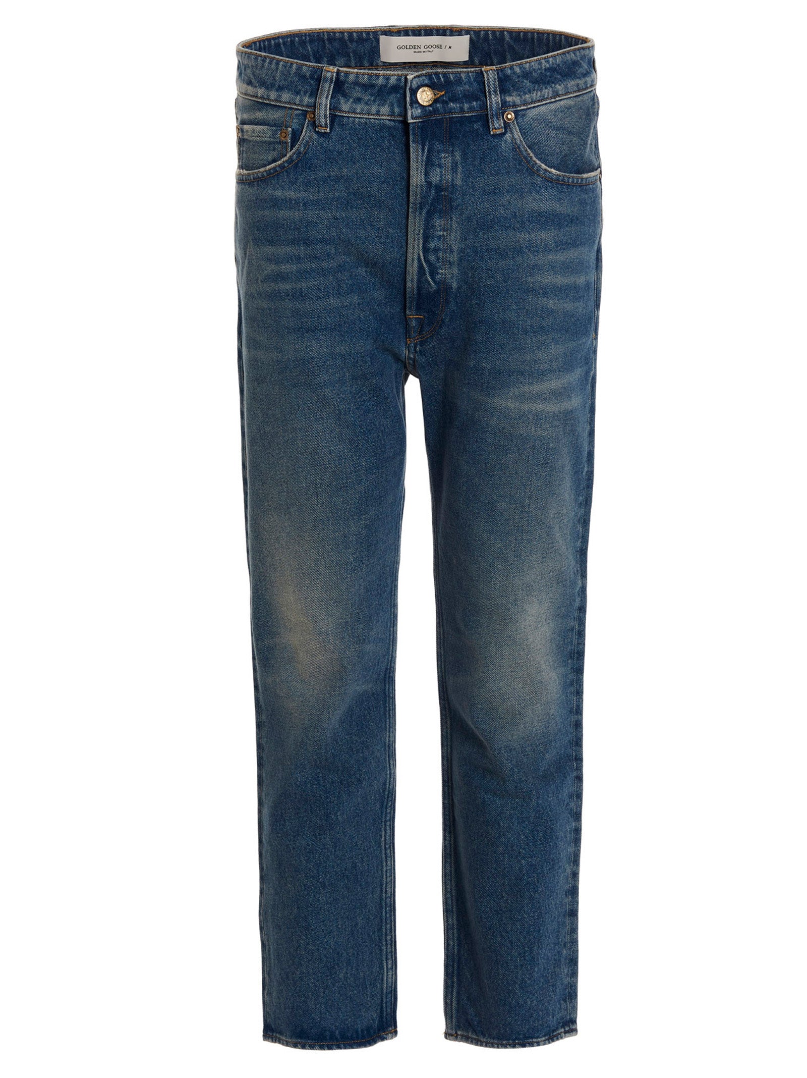 Jeans de mezclilla de piedra media de 5 bolsillos 'feliz' con cierre de pierna recta y botones.
