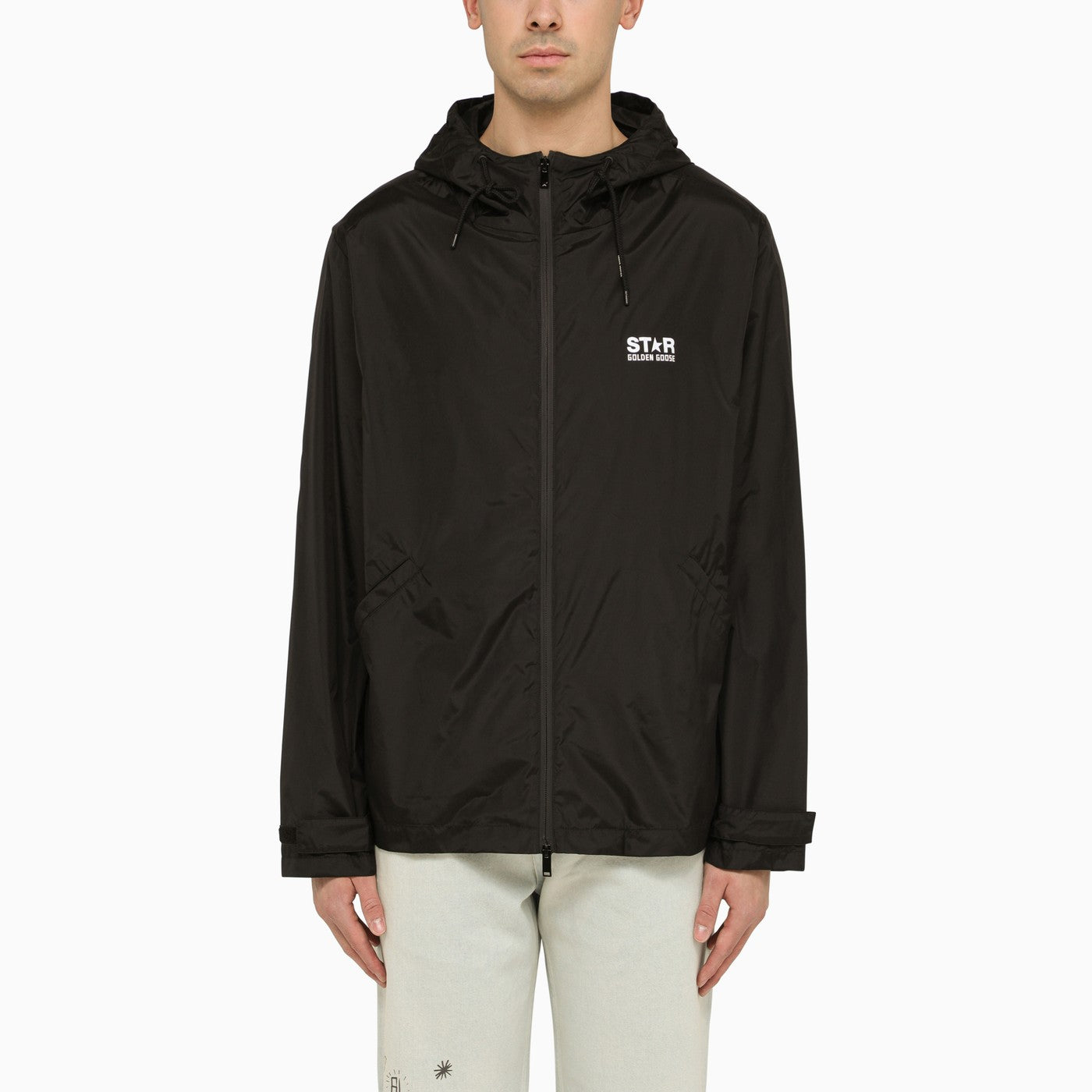 La liviana chaqueta de nylon negra de la marca Golden Goose Deluxe con una capucha con cordero, una doble cierre delantera, dos bolsillos delanteros, logotipo de letras en el cofre, una impresión contrastante en la parte posterior y mangas largas con un manguito elástico que se puede ajustar con velcro .
