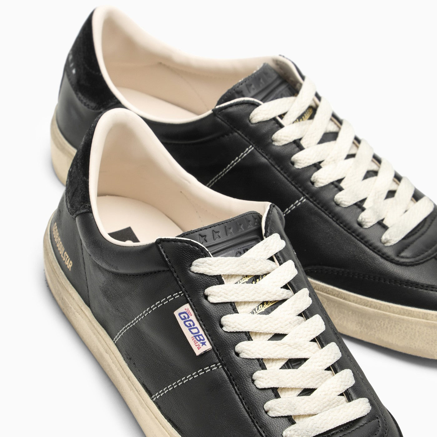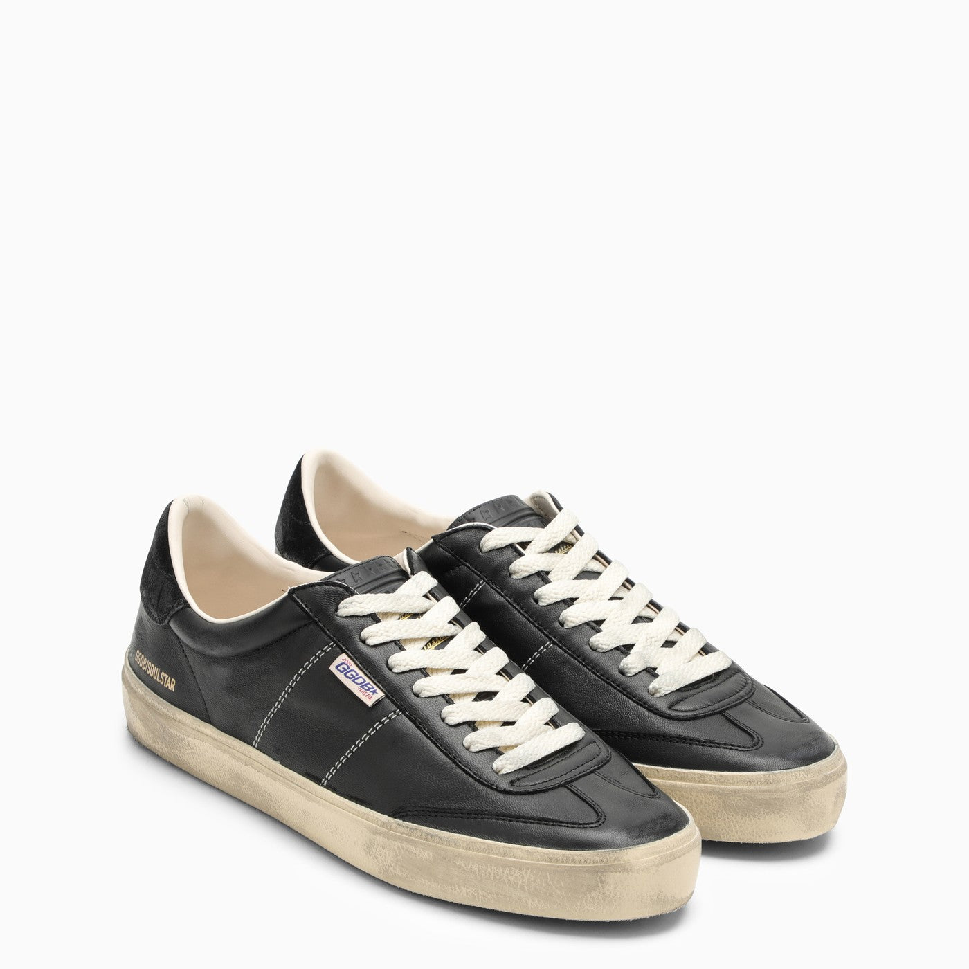 Entrenador de cuero negro de cuero negro de la marca Golden Goose Deluxe con un dedo redondo, una fijación de cordones, una lengua de marca y una suela de goma. Modelo con mano de obra de efecto vintage.
