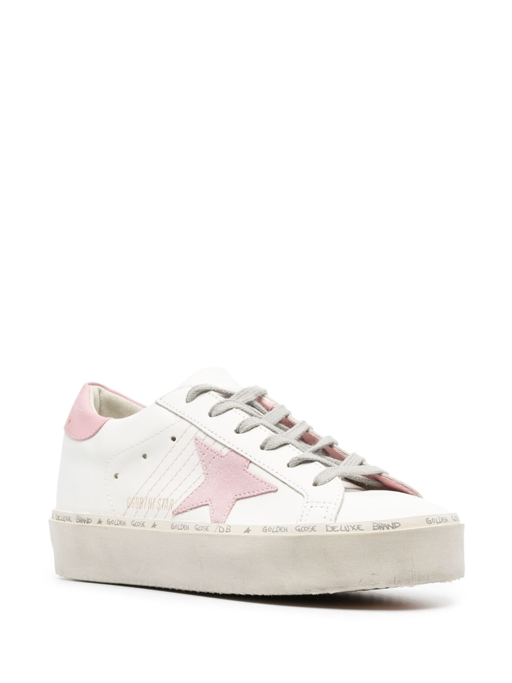 Hi Star Platform Sneakers de Golden Goose con blanco, rosa claro, cuero de búfalo, parche de estrella de la firma a los lados, acabado angustiado, mostrador de tacón de marca contrastante, dedo del pie redondo, fijación de cordones delanteros, plantilla de marca, planta de plataforma y suela de goma plana.