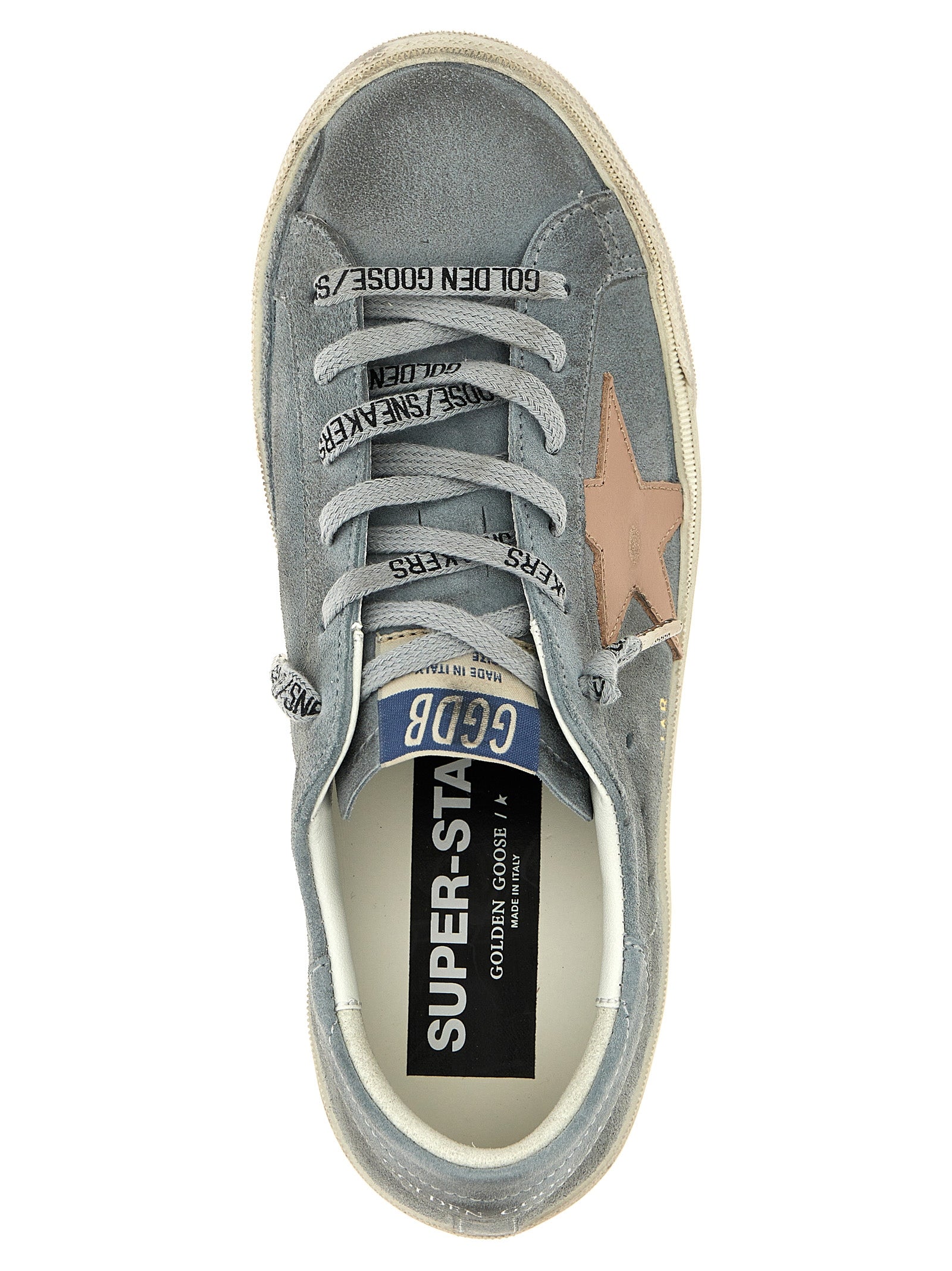 Las zapatillas de gamuza superestrella con estrella lateral de cuero contrastante, cordones, suela de goma y detalles de efectos usados.