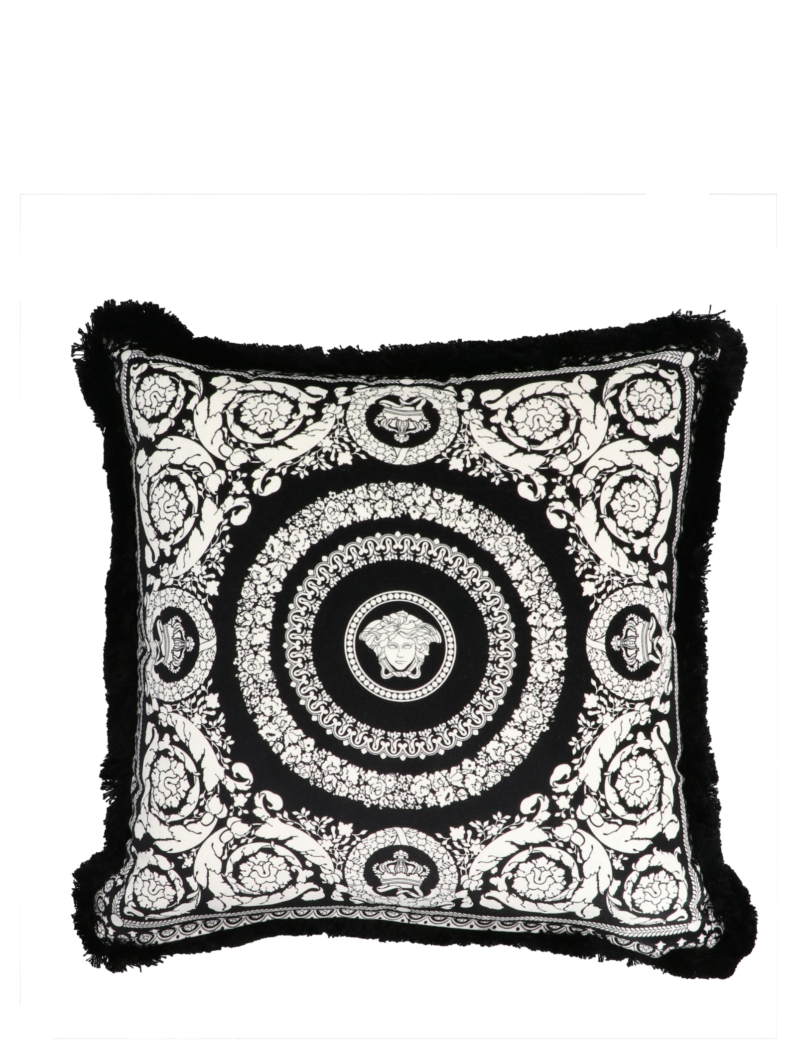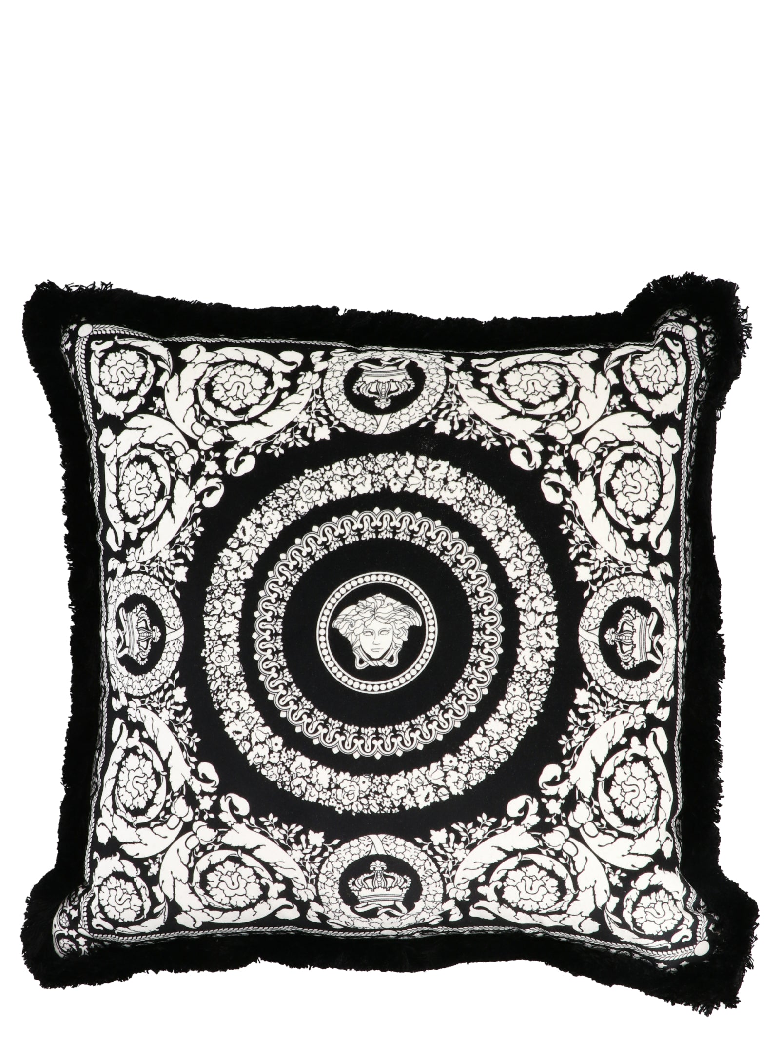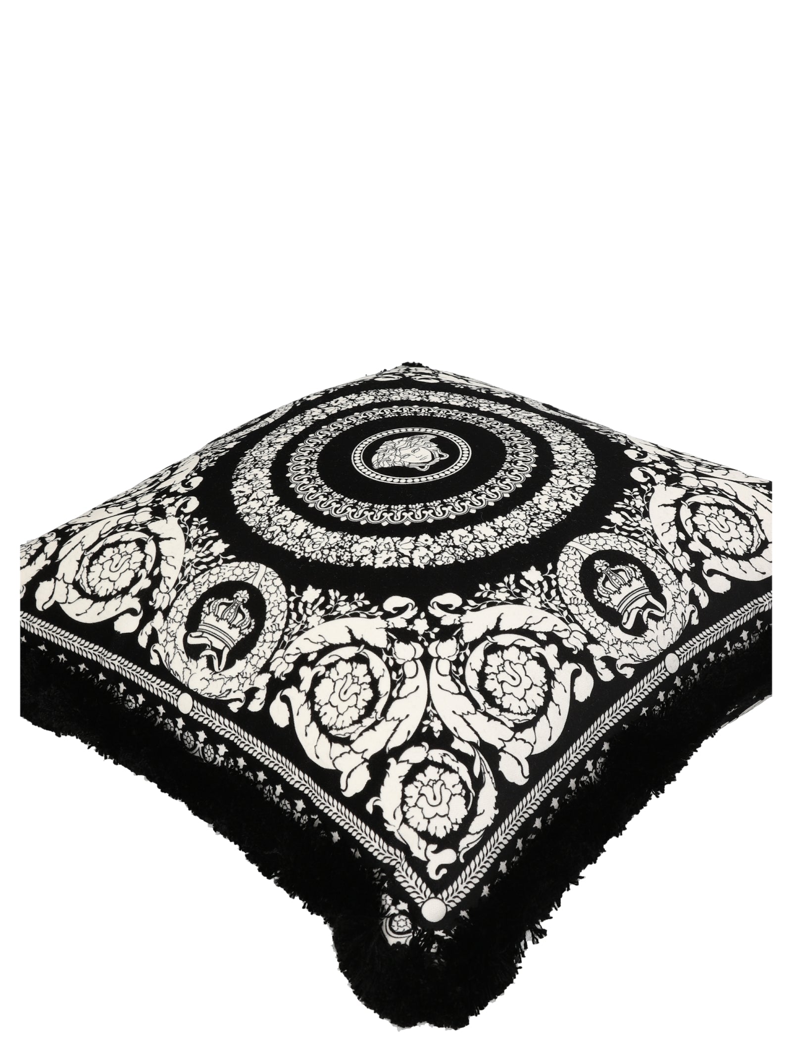 Pequeño cojín de terciopelo con estampado 'Barocco Foulard', acolchado y adornos con flecos.