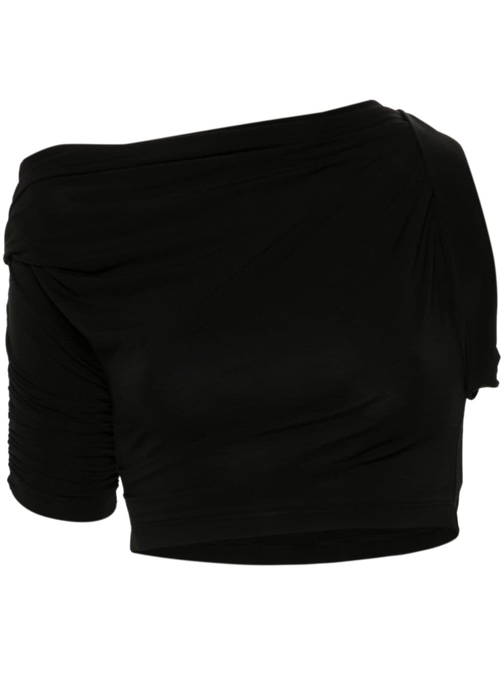 Diseño de diseño de estiramiento negro Diseño asimétrico Twist de cuello detallado de la manga corta del hombro