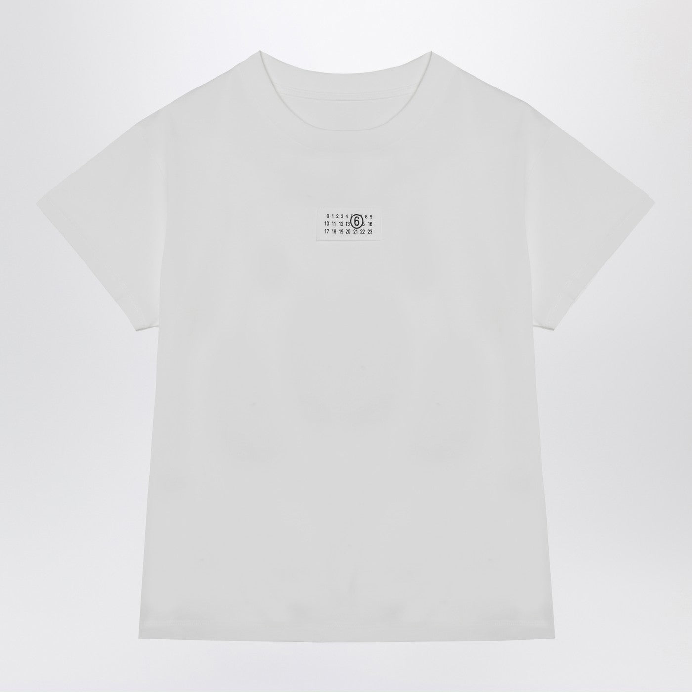 Camiseta MM6 Maison Margiela en camiseta de algodón blanco, con un cuello de la tripulación acanalada, mangas cortas, un parche con firma numérica en la parte delantera, línea de puntada blanca en la parte posterior y un diseño recortado.