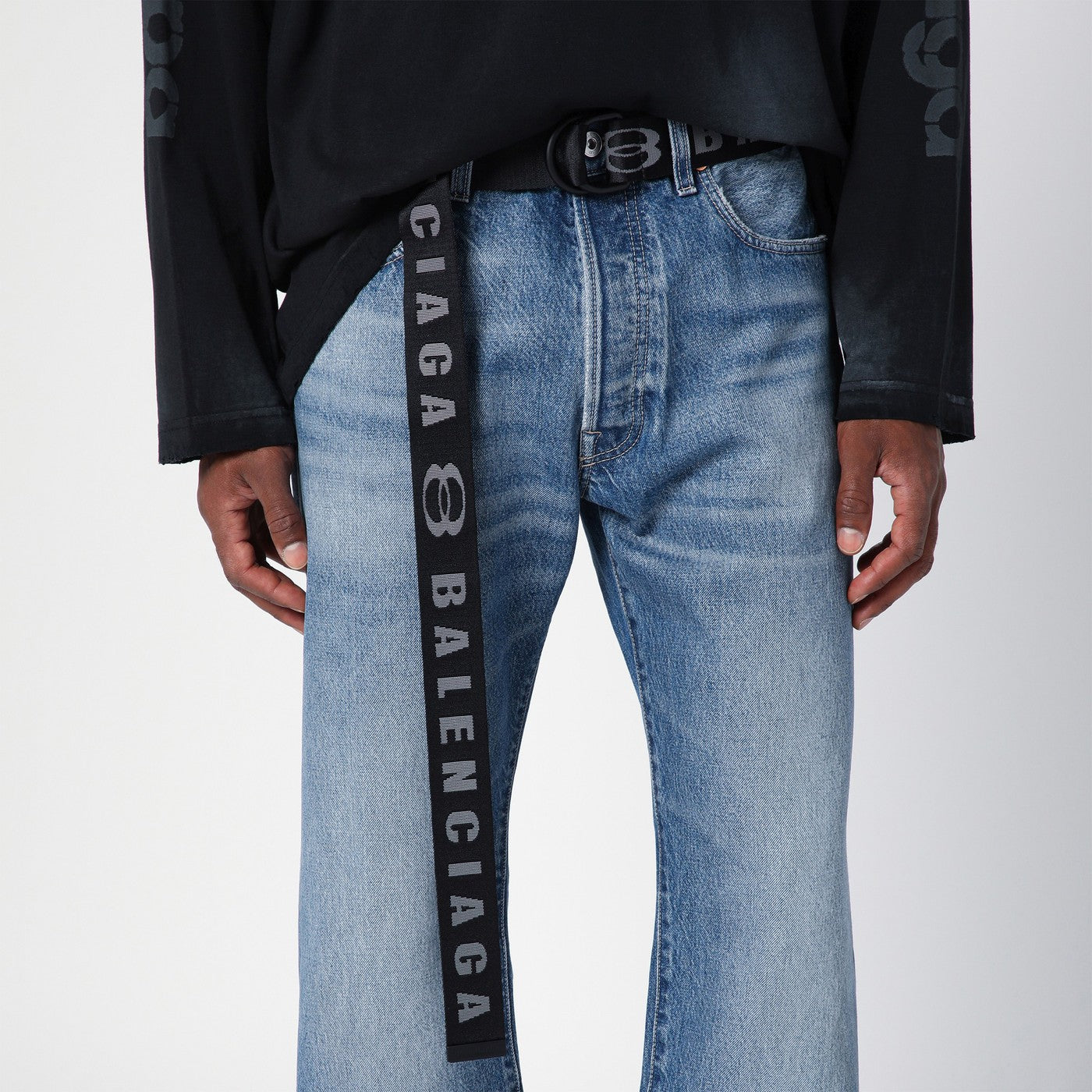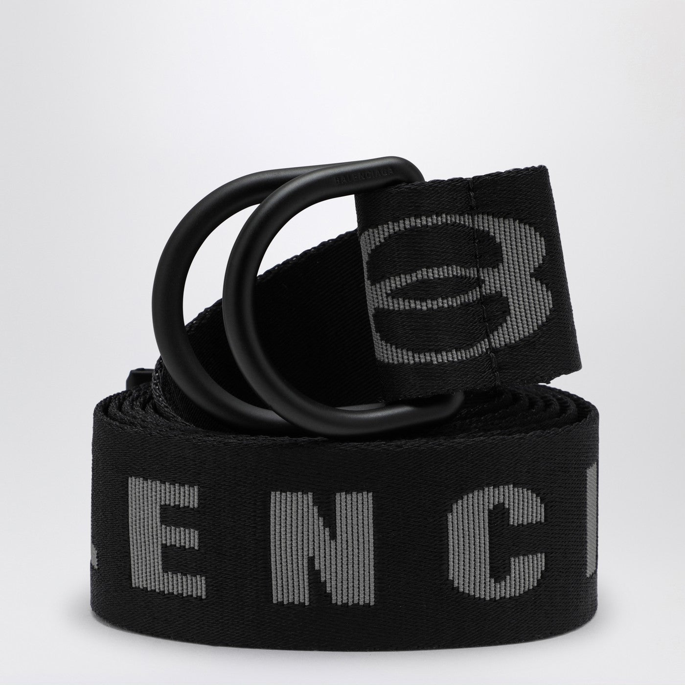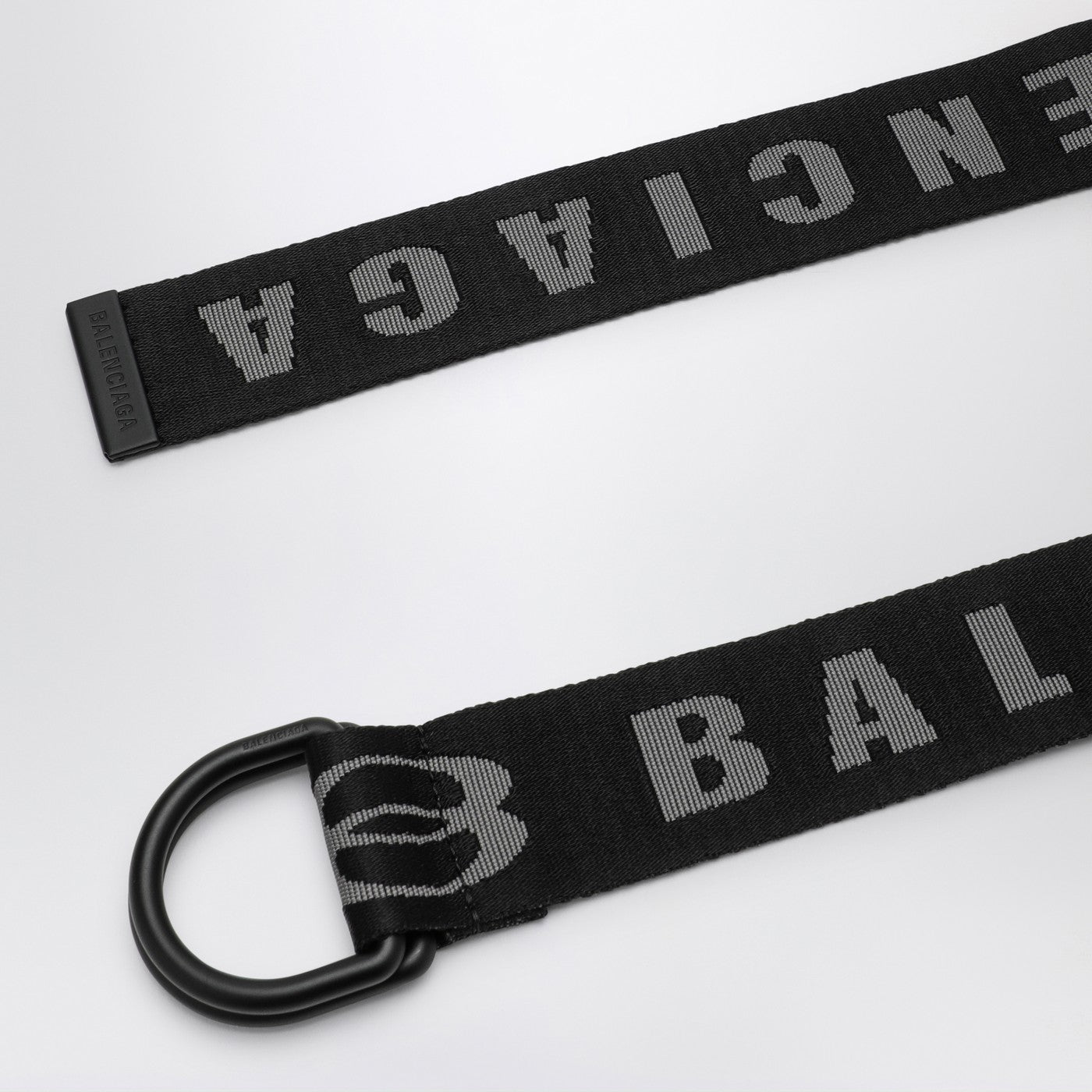 Cinturón en lienzo gris negro y oscuro de Balenciaga, con un logotipo de letras contrastante, molduras negras mate y fijación ajustable.