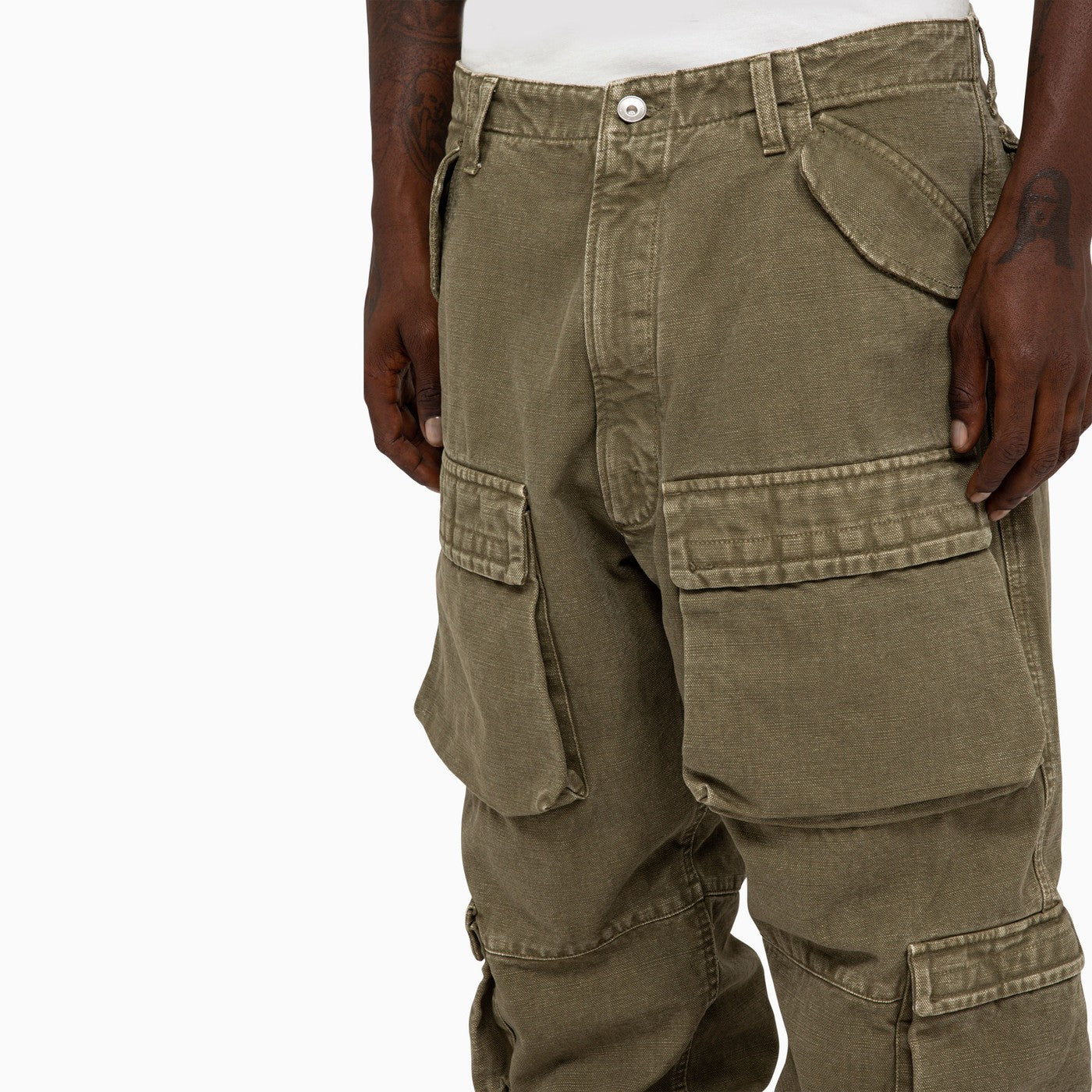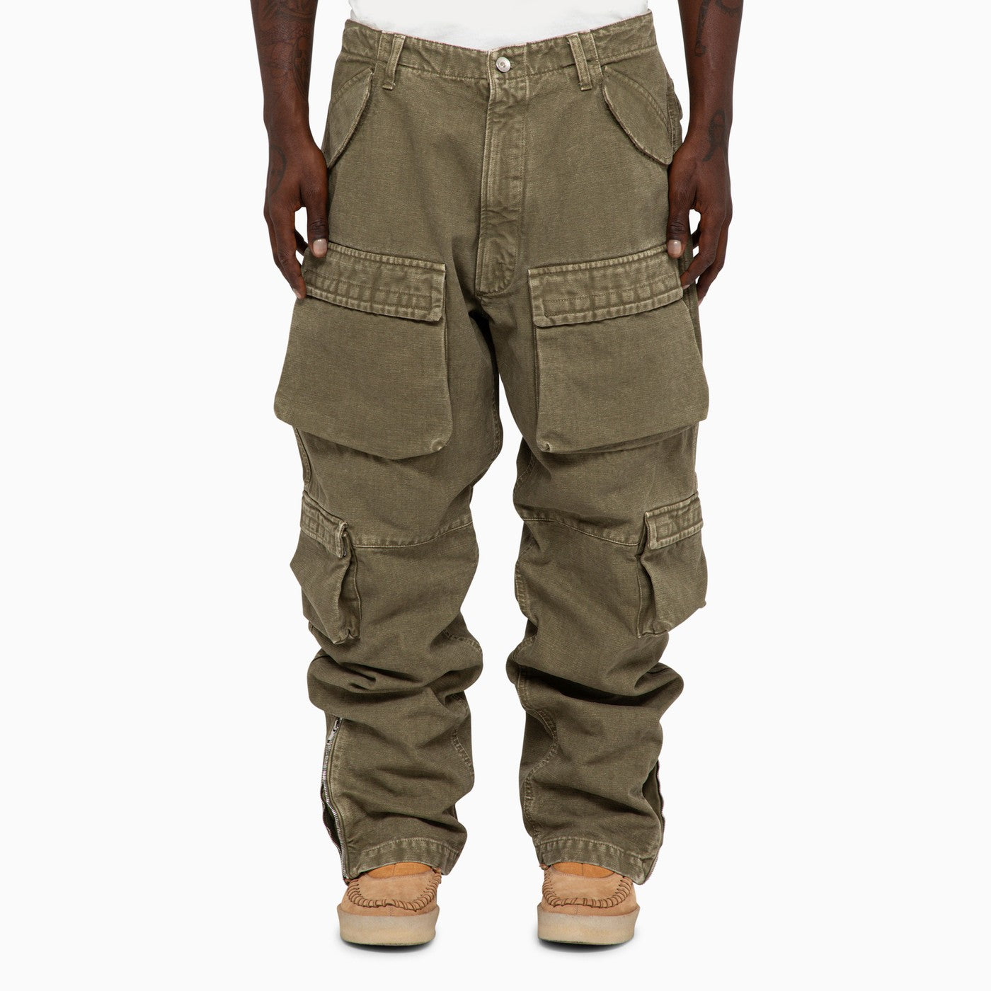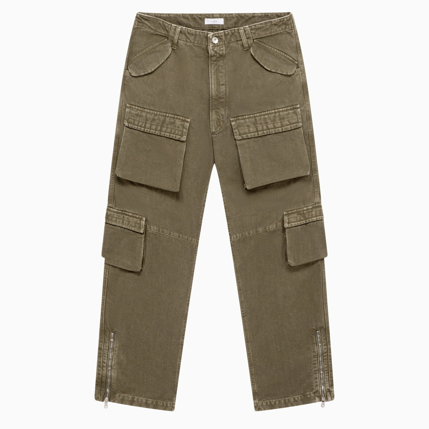 Pantalones largos de lienzo de algodón verde militar en 1989 Studio con bolsillos de carga maxi, cremalleras de tobillo, fijación de botones y bucles de cintura.