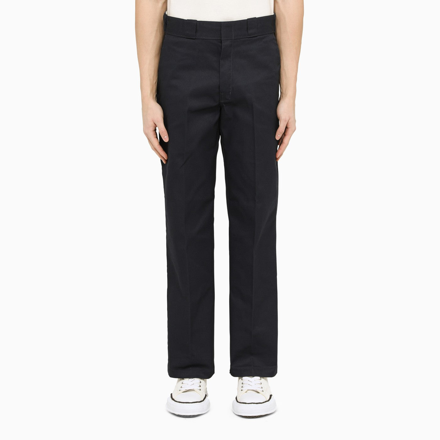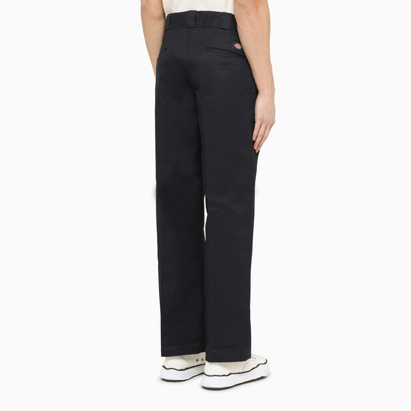 Blue Dickies pantalones con un gancho y una cremallera, bucles de cintura, cuatro bolsillos, parche de logotipo en la parte posterior y un corte recto.