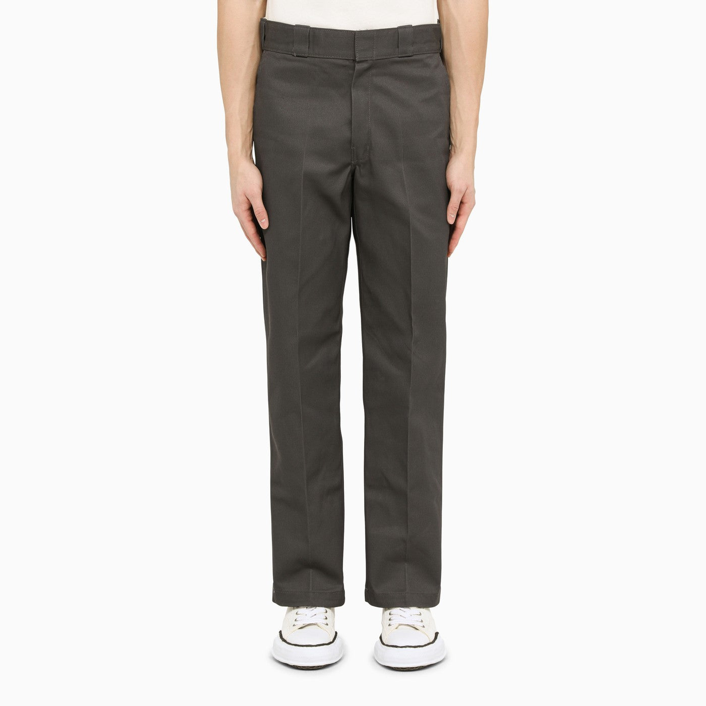 Pantalones grises Dickies con un gancho y una cremallera, bucles de cintura, cuatro bolsillos, parche de logotipo en la parte posterior y un corte recto.