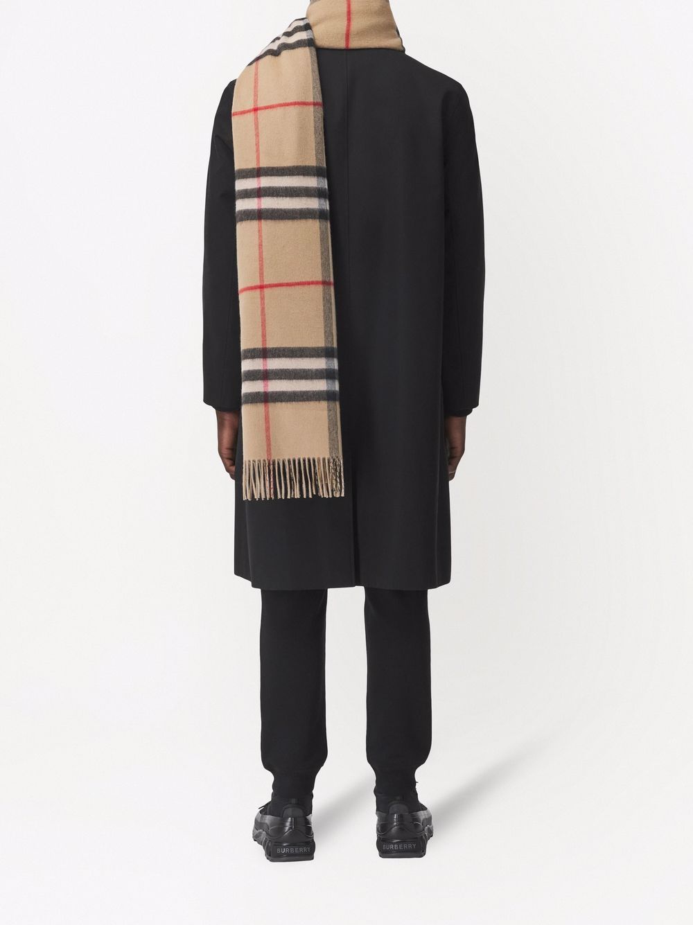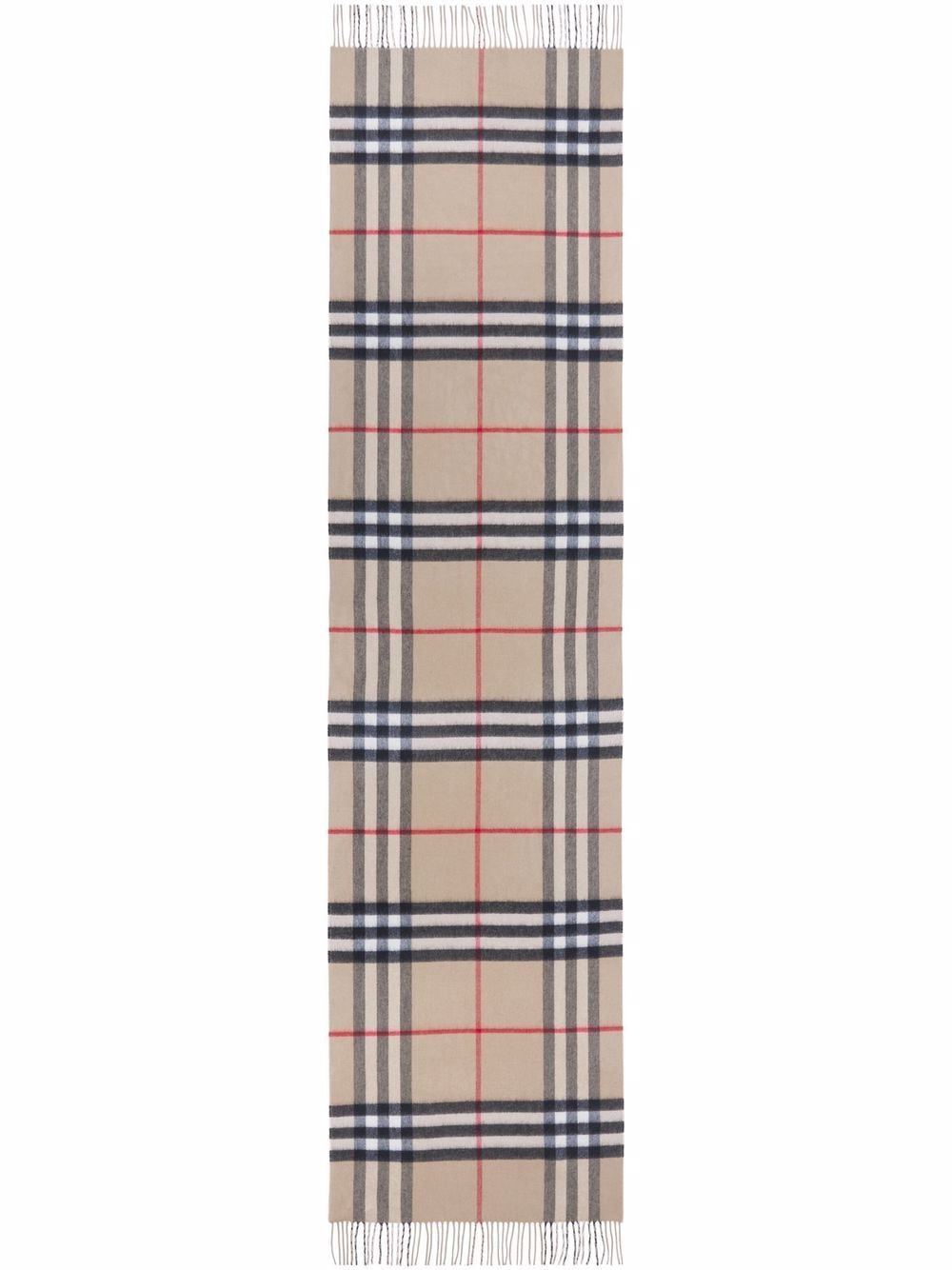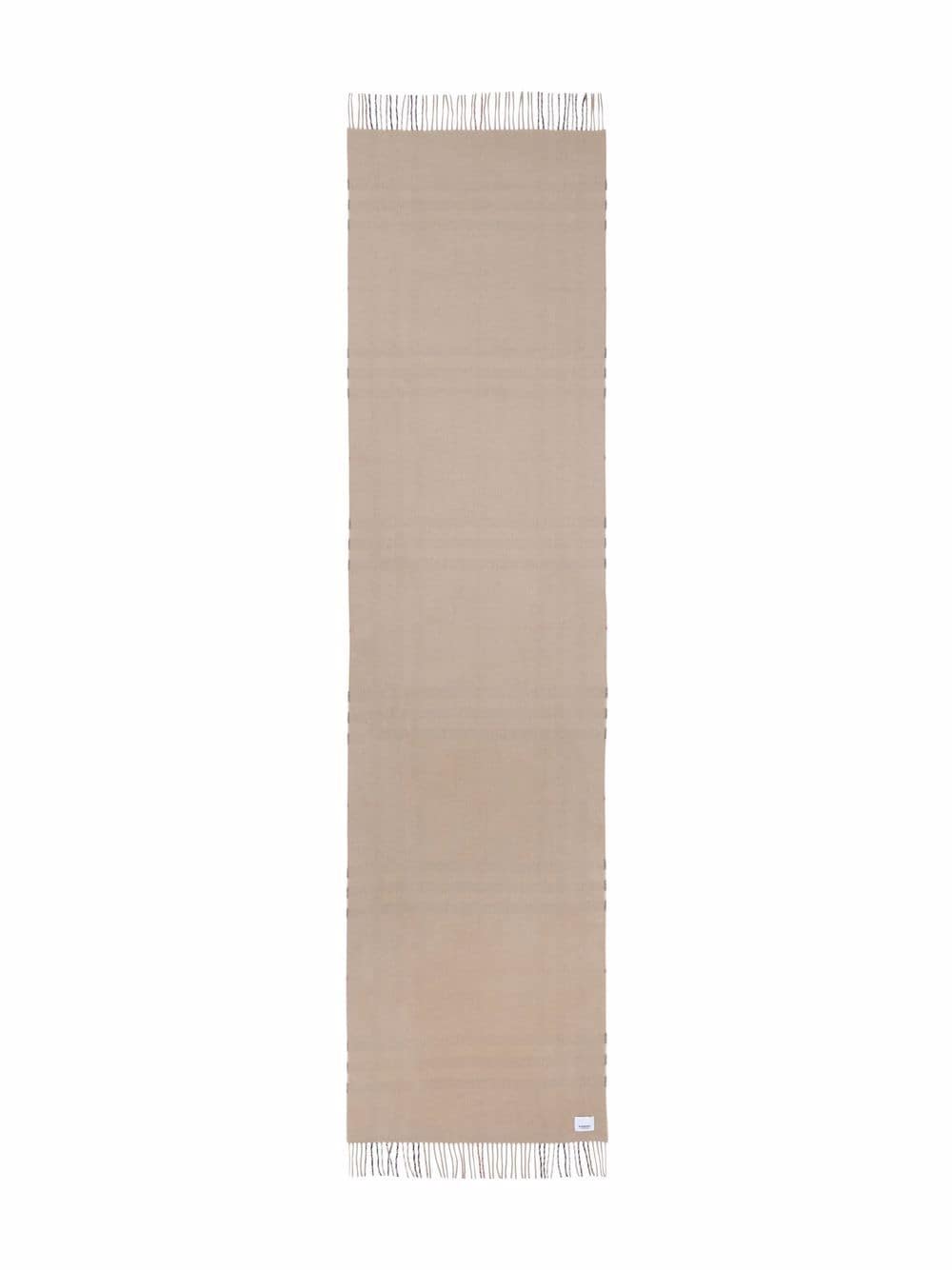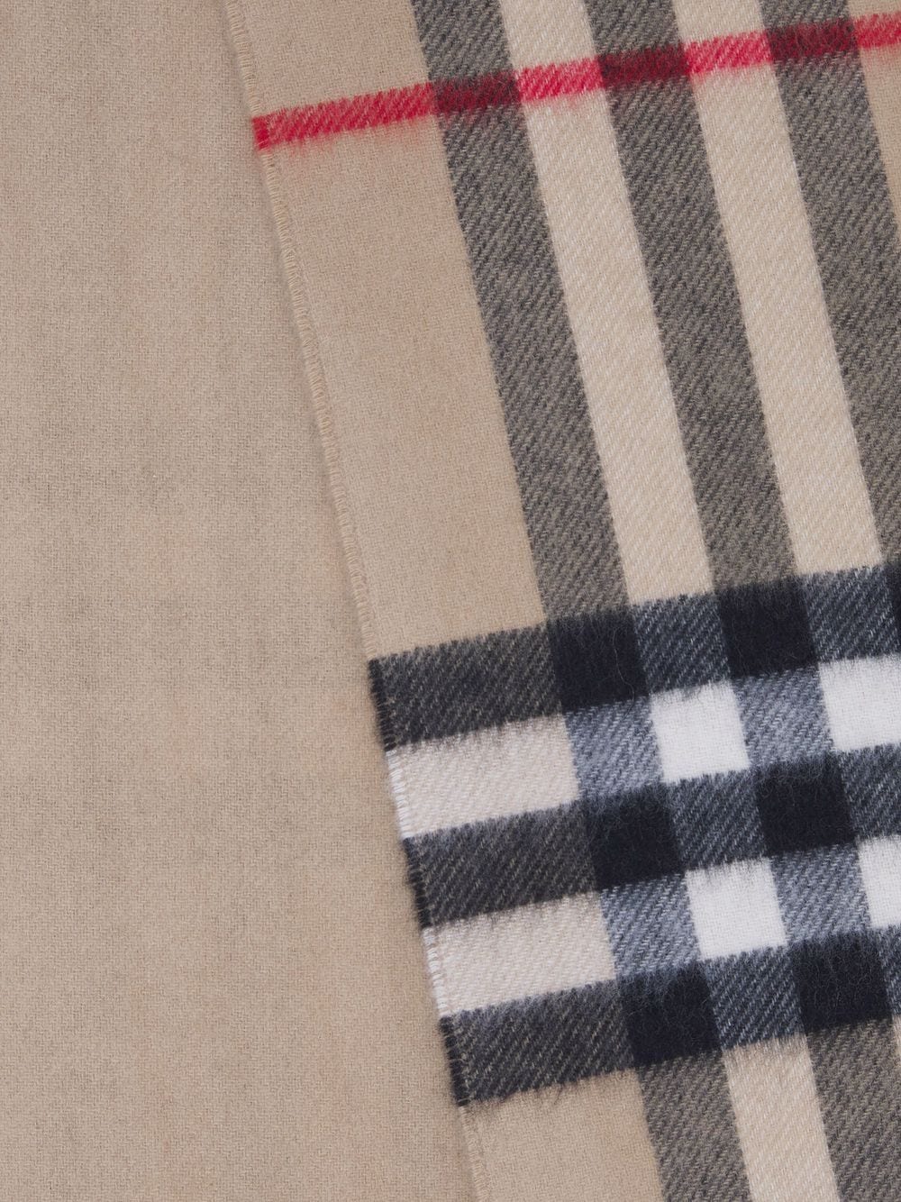 Reversible Check Cashmere Buff de Burberry con beige, cachemira, patrón de cheque y borde con flecos.