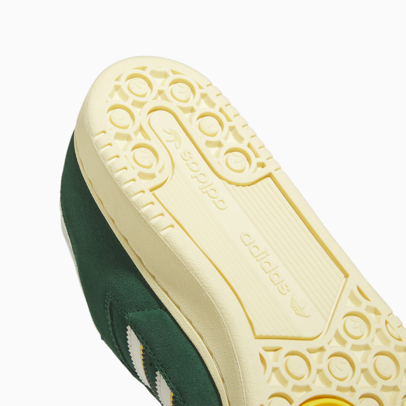 Entrenador de cuero bajo de Adidas Originals, con una parte superior verde con dedo del pie redondeado, fijación de cordones, suela de goma y logotipo en el lado y la lengua.