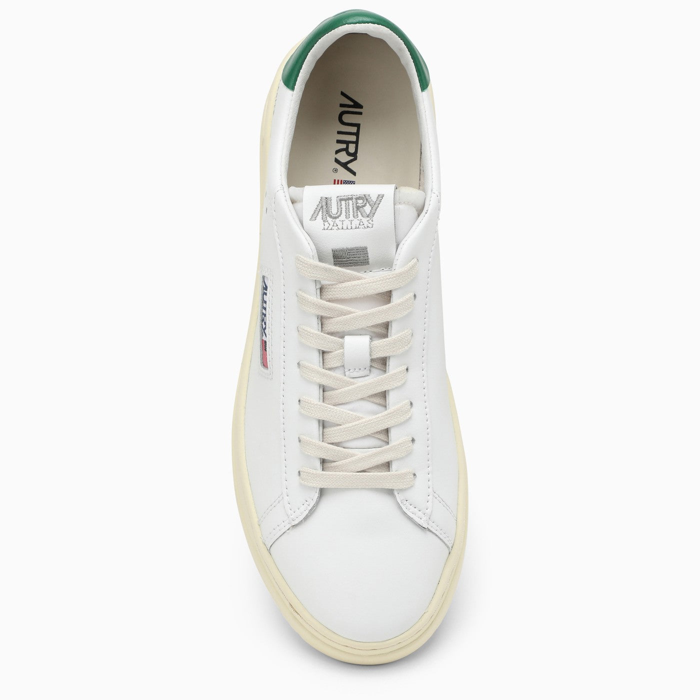 Sneakers de Dallas bajas de Autry en la parte superior de cuero blanco con encaje delantero abasteciendo, etiqueta tonal cosida sobre una lengua de cuero, estampado de logotipo lateral, collar de tobillo acolchado, parche de espalda de tacón verde con logotipo relleno y suela de goma crema con logotipo.