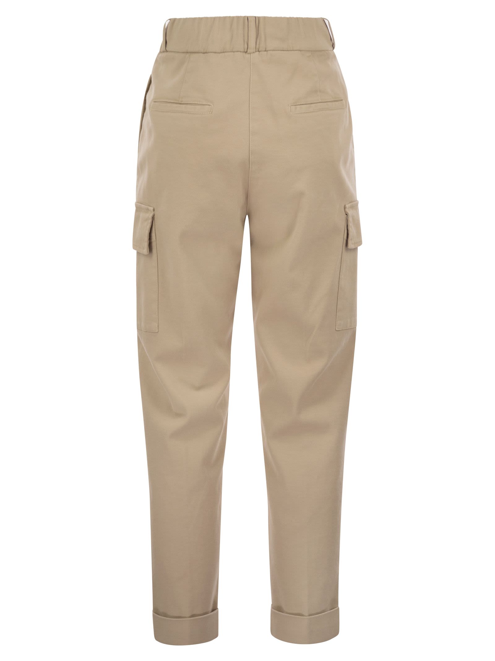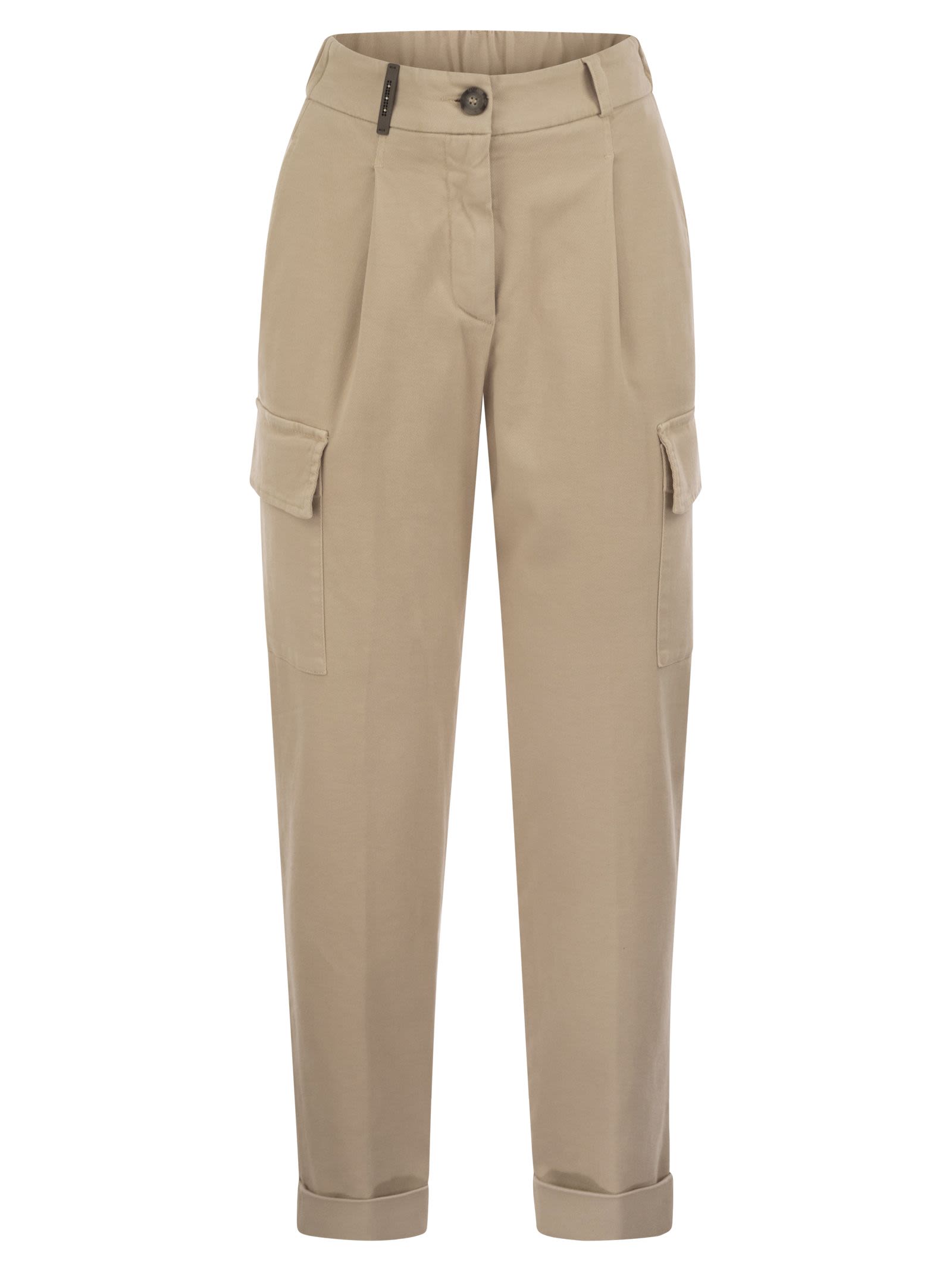 Crafted from garment-dyed soft stretch cotton gabardine, these trousers are a perfect blend of elegance and comfort. The design features pleats and an elastic waistband at the back of the waist, providing a soft, adaptable fit that flatters any silhouette. These carrot cargo trousers are perfect for those looking for a timeless style with a contemporary twist. - Trousers with pleats and elastic on the back - Bottom with 4 cm high flap - Pockets inserted in the side, welt on the back, patch with flap on leg - Loose fit - Regular life - Front zip and button closure DESIGNER ID: P04876T302487 844