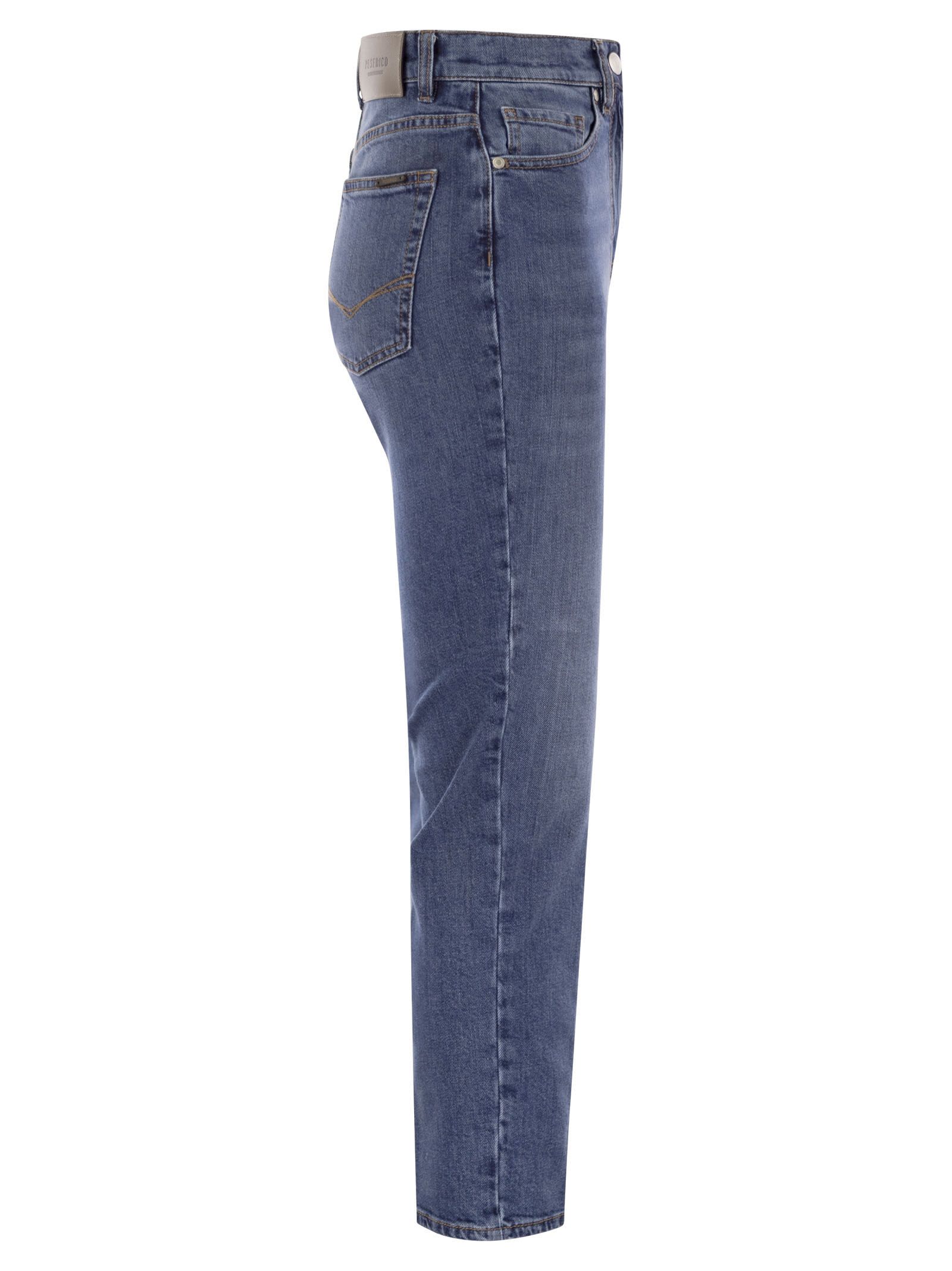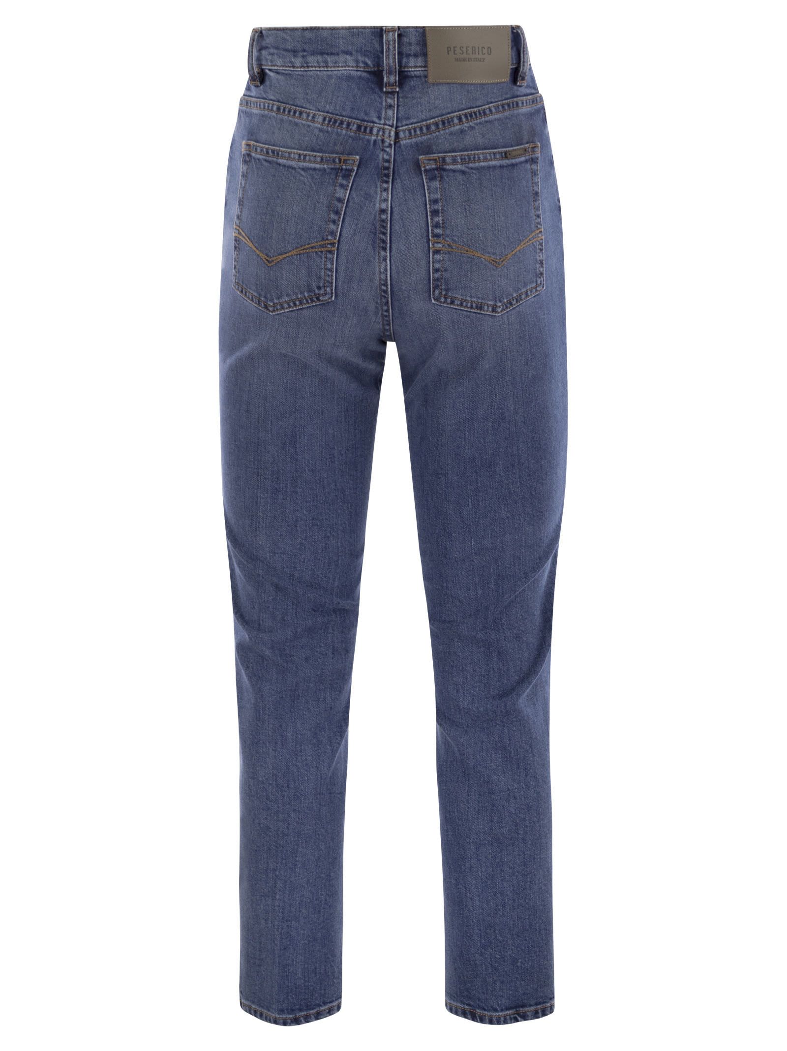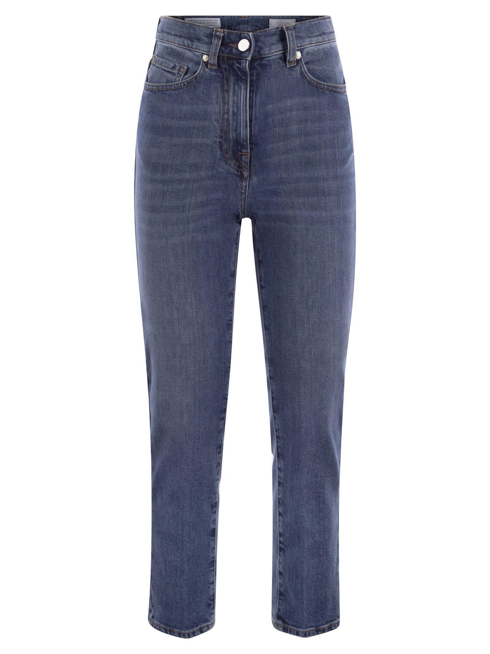 El pantalón de mezclilla, hecho de algodón de comodidad, presenta un lavado atemporal que se expresa en un azul medio. El ajuste delgado y la cintura alta le dan a la prenda la versatilidad atemporal. Este pantalón encarna el equilibrio perfecto entre estilo y practicidad, perfecto para enfrentar la temporada de verano con elegancia. - Pantalones de mezclilla de patrón lavado: bolsillos de carter en la parte delantera, parche en la parte posterior - costura de 2 agujas - ajuste delgado - cintura alta - cremallera delantera y botón expuesto ID de diseño del diseñador: A04525L24Q04280 961