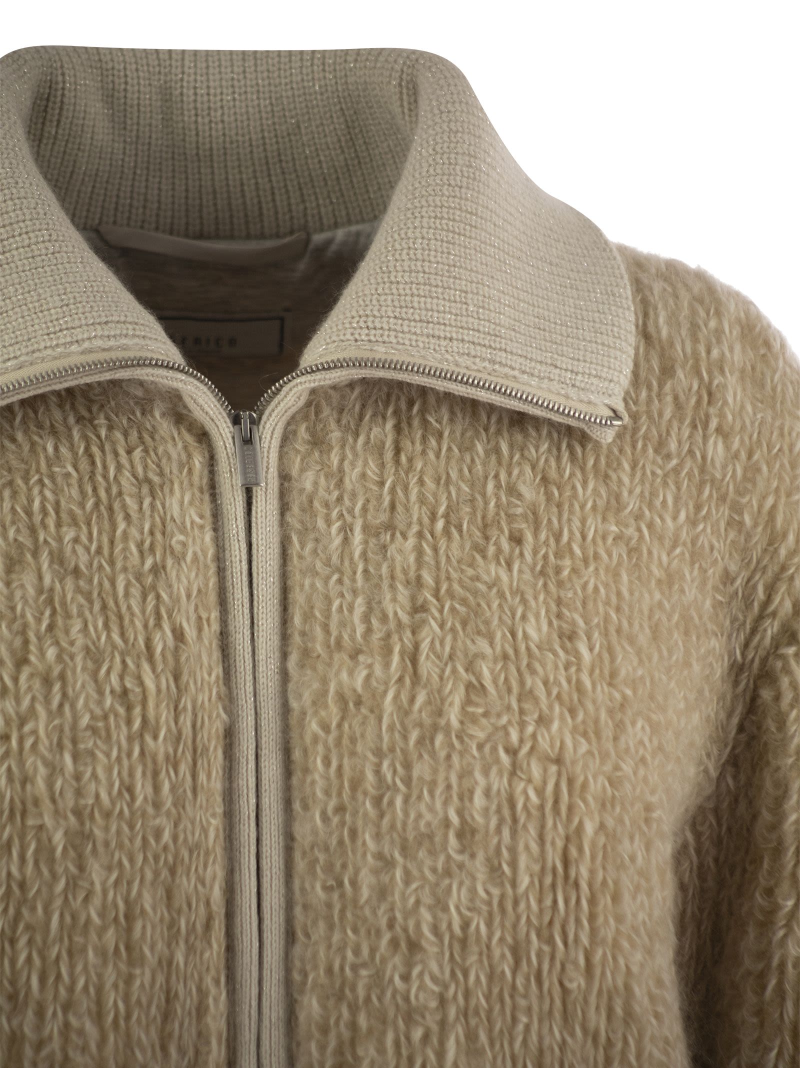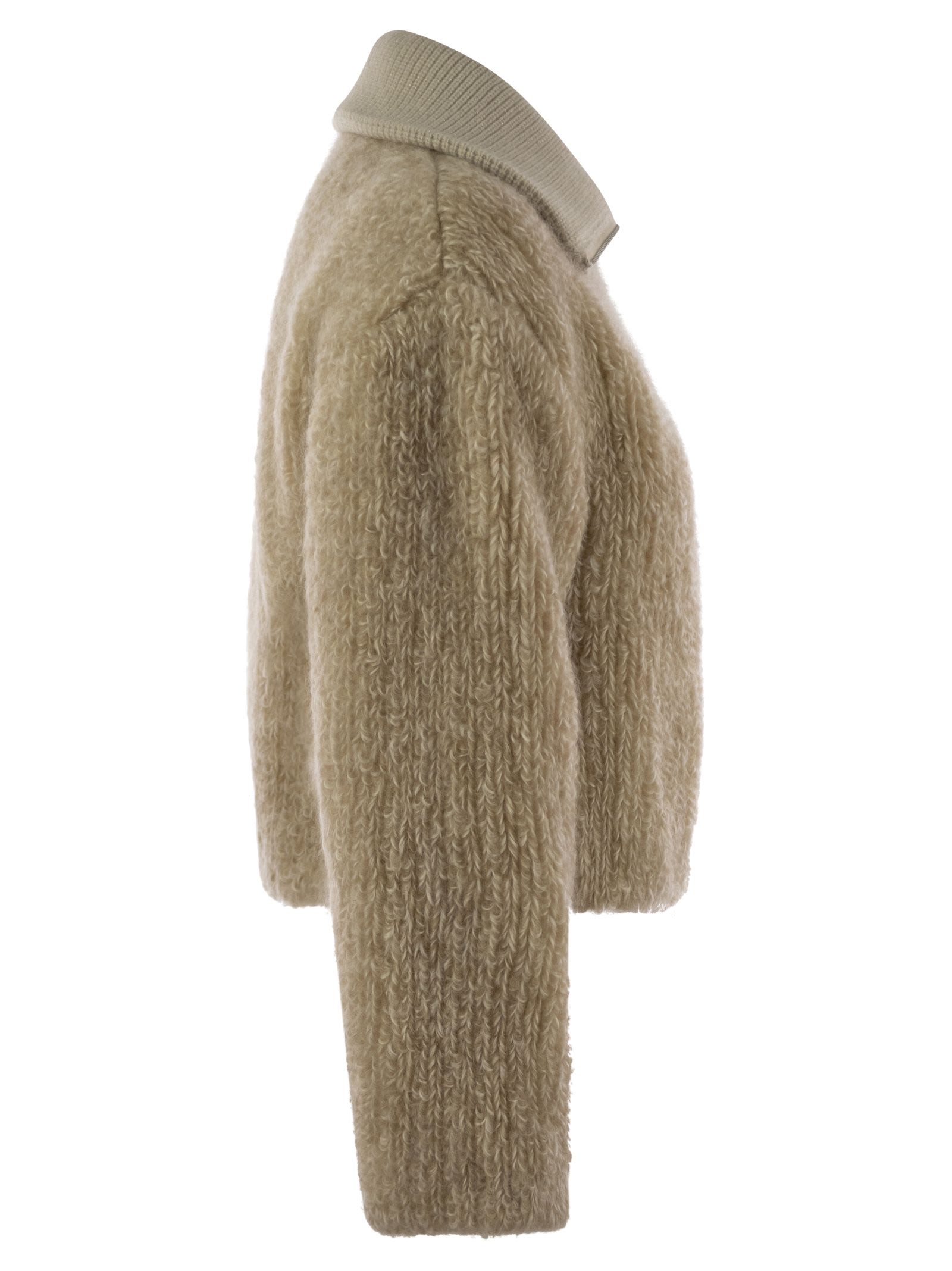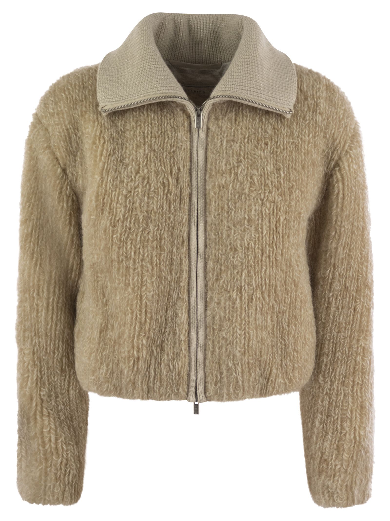 La chaqueta Mohair, Camel y Virgin Wool presenta un punto que le da una mezcla de elegancia y practicidad. Las mangas largas y la presencia de elástica en el fondo agregan dinamismo y versatilidad a la prenda. Una combinación armoniosa de estilo y comodidad con un toque de practicidad sofisticada. - Chaqueta con cuello de punto - mangas largas y vuelta caída - cierre delantero de la cremallera expuesta - ID de diseñador de cremallera de doble depósito: A21464A5368 A46
