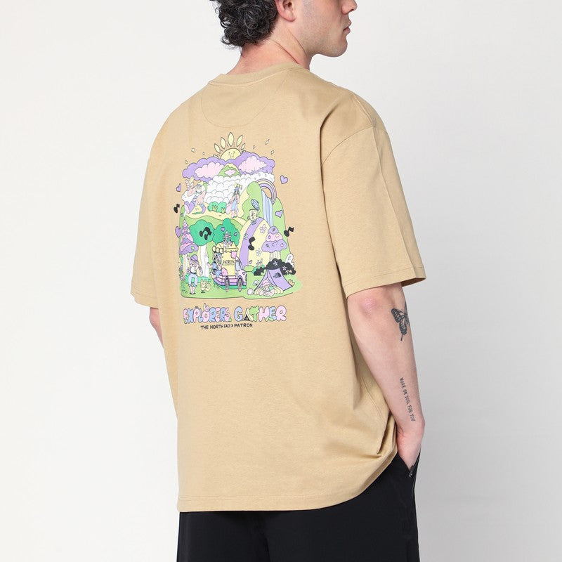 Camiseta de algodón Kaki Beige junto a North Face, con mangas cortas, cuello de la tripulación acanalada, bordado de logotipo en el cofre, estampado gráfico en la parte posterior y un ajuste de gran tamaño.