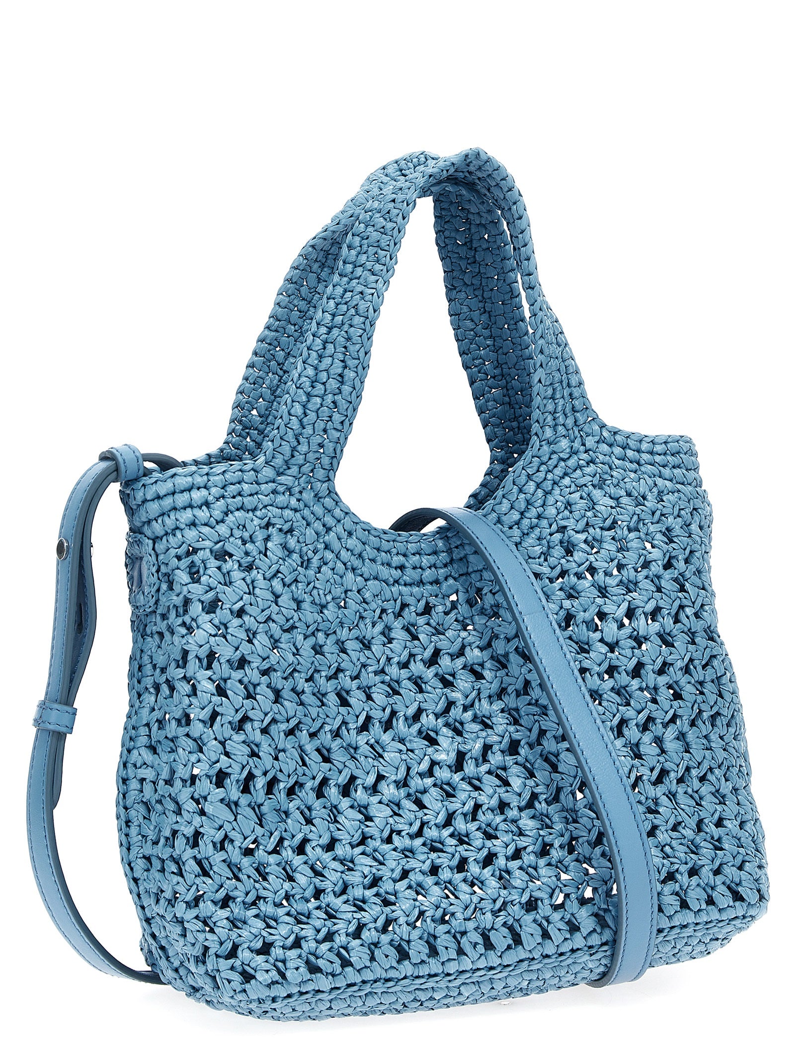 Pequeña bolsa de compras de rafia viscosa con procesamiento de crochet artesanal, oval de cuero con logotipo en relieve, manija doble fija, correa de hombro de cuero ajustable y extraíble.