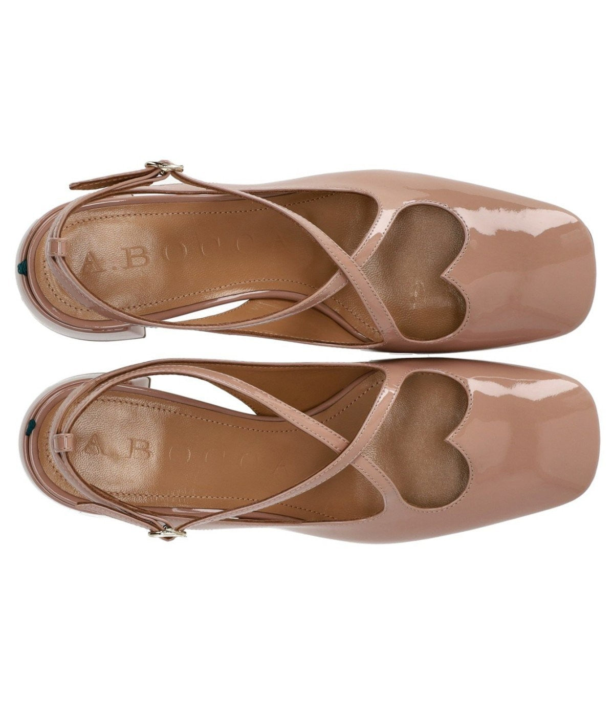 A.Bocca Slingback Bomba hecha en patente rosa antigua, con una punta ligeramente cuadrada, correas cruzadas en el frente que forman un corazón. Cierre de la correa del tobillo, forro de cuero y plantilla. La suela de cuero, altura del talón de 5 cm.