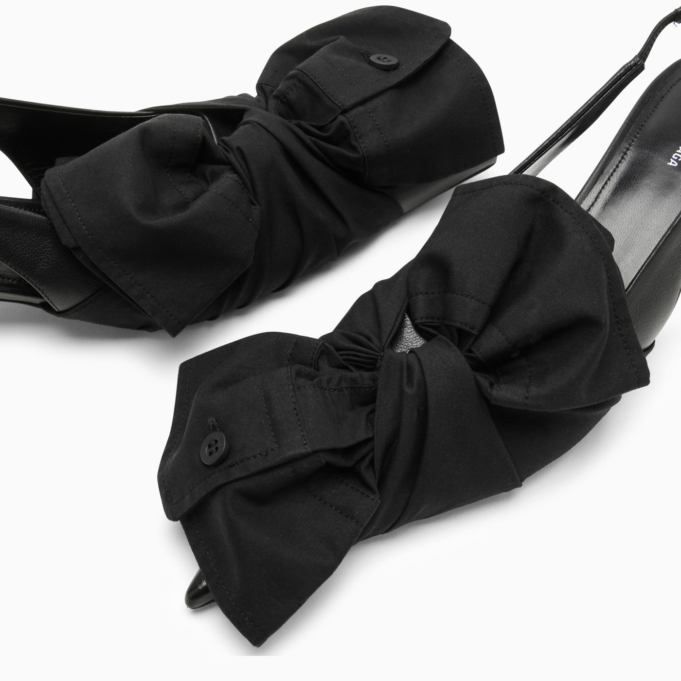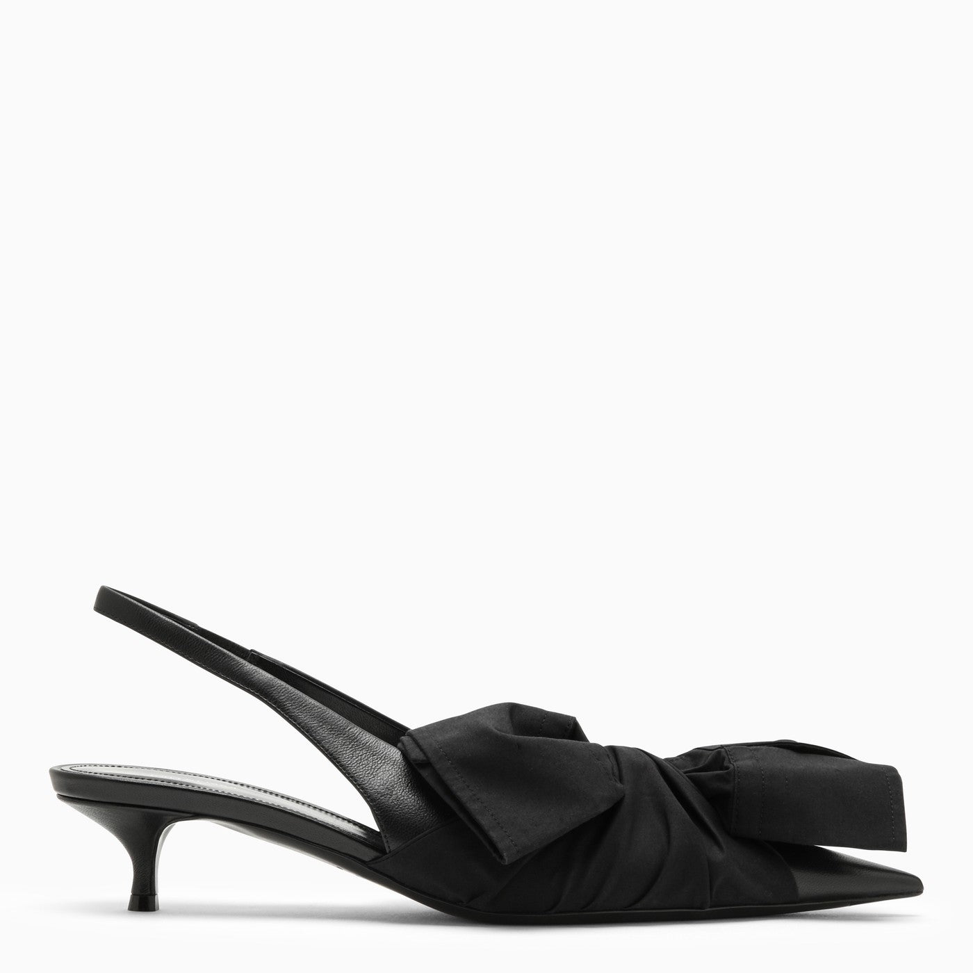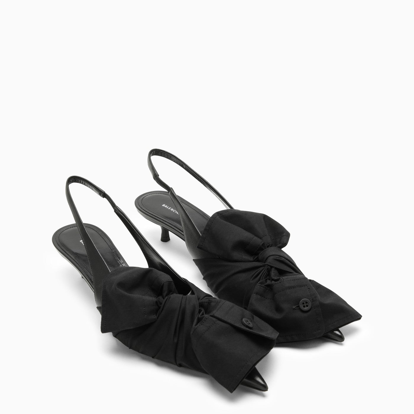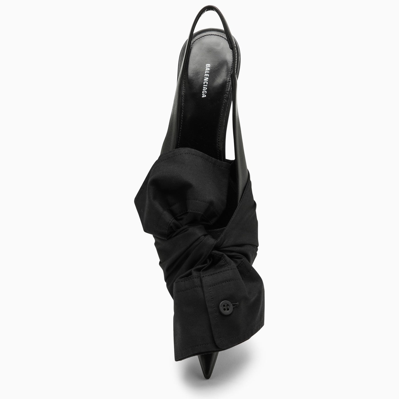 Slingback negro con un diseño de punta puntiaguda de Balenciaga, inserto del nudo delantero con puños de camisa, correa elástica y suela de cuero.