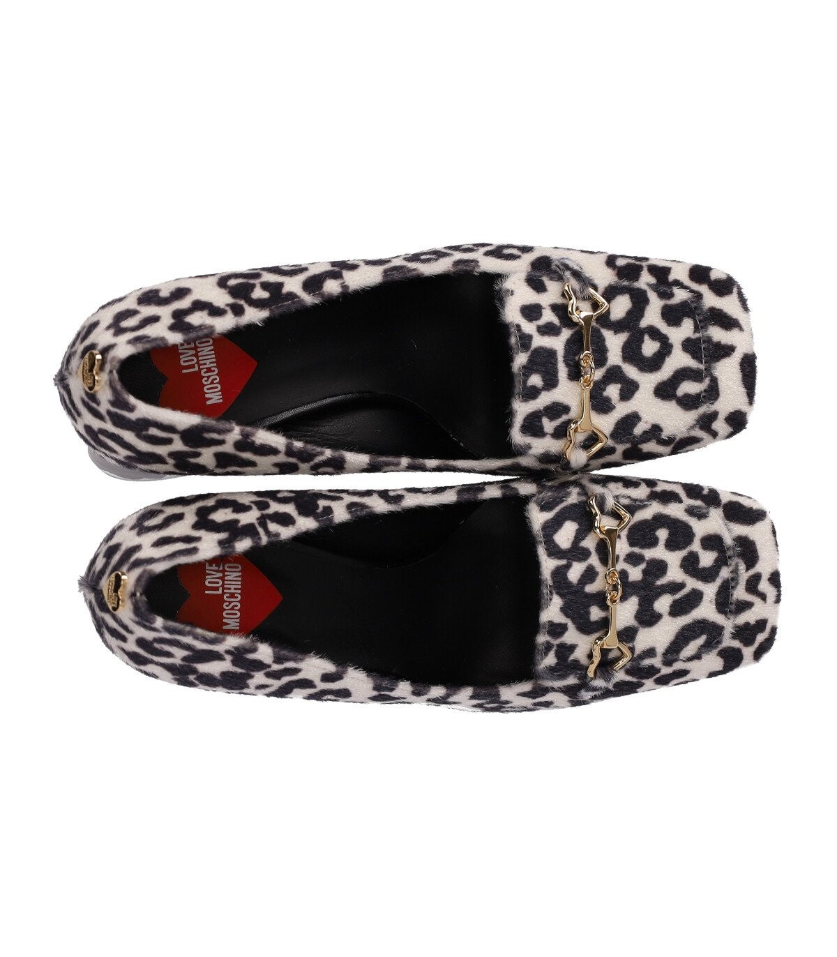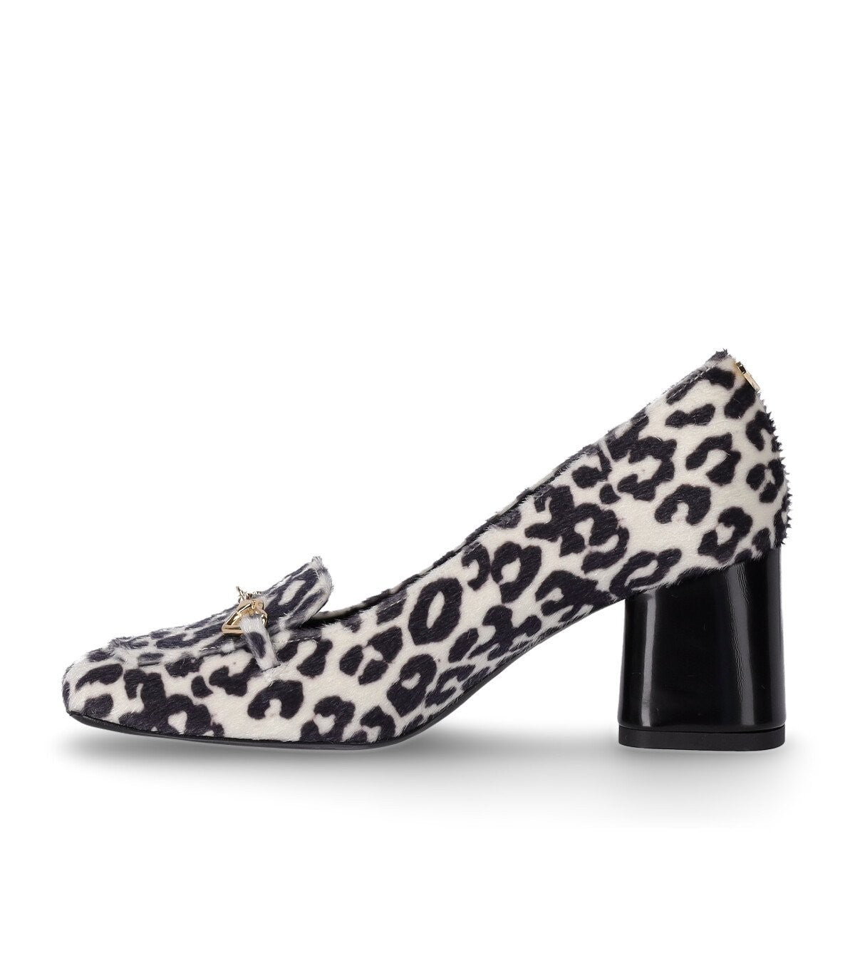 Love Moschino Bomba hecha de tela de efecto pony con estampado de leopardo en tonos de blanco y negro, adornada con una mochila dorada en la parte delantera. Interior de cuero y placa del logotipo en la parte posterior. Sola de goma con tacón ancho, altura de 6.5 cm.