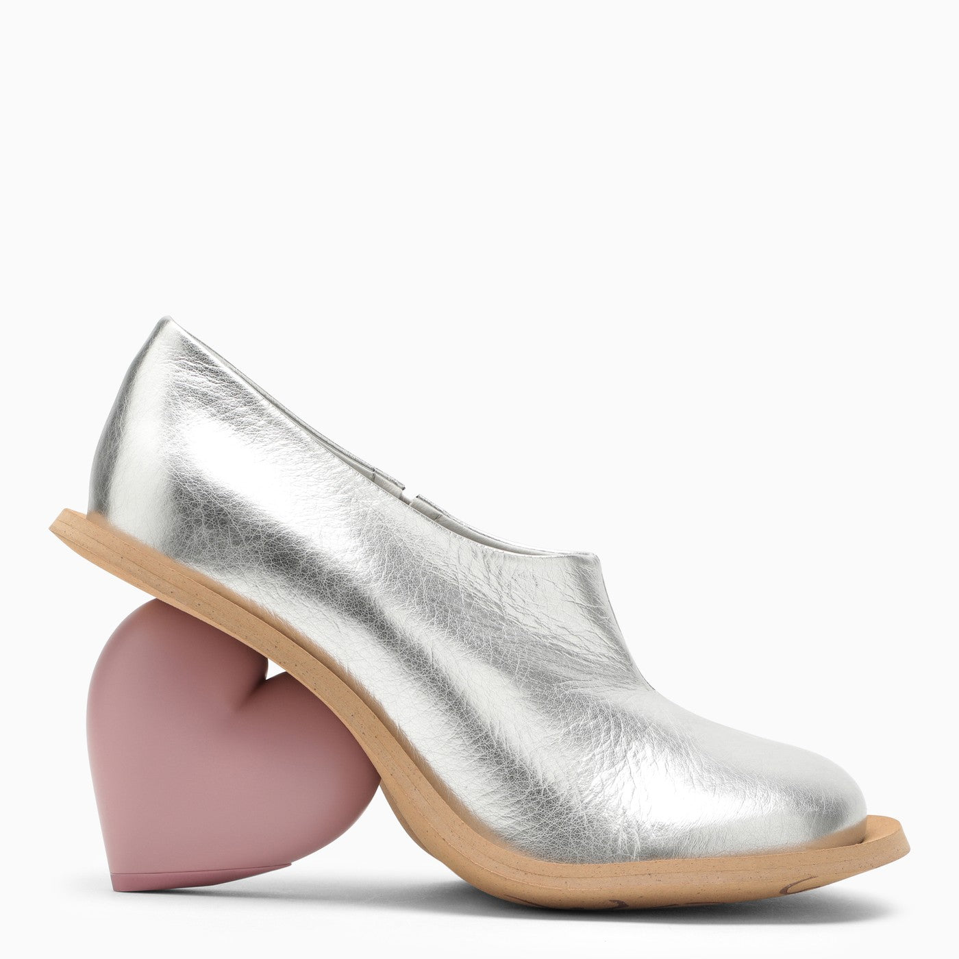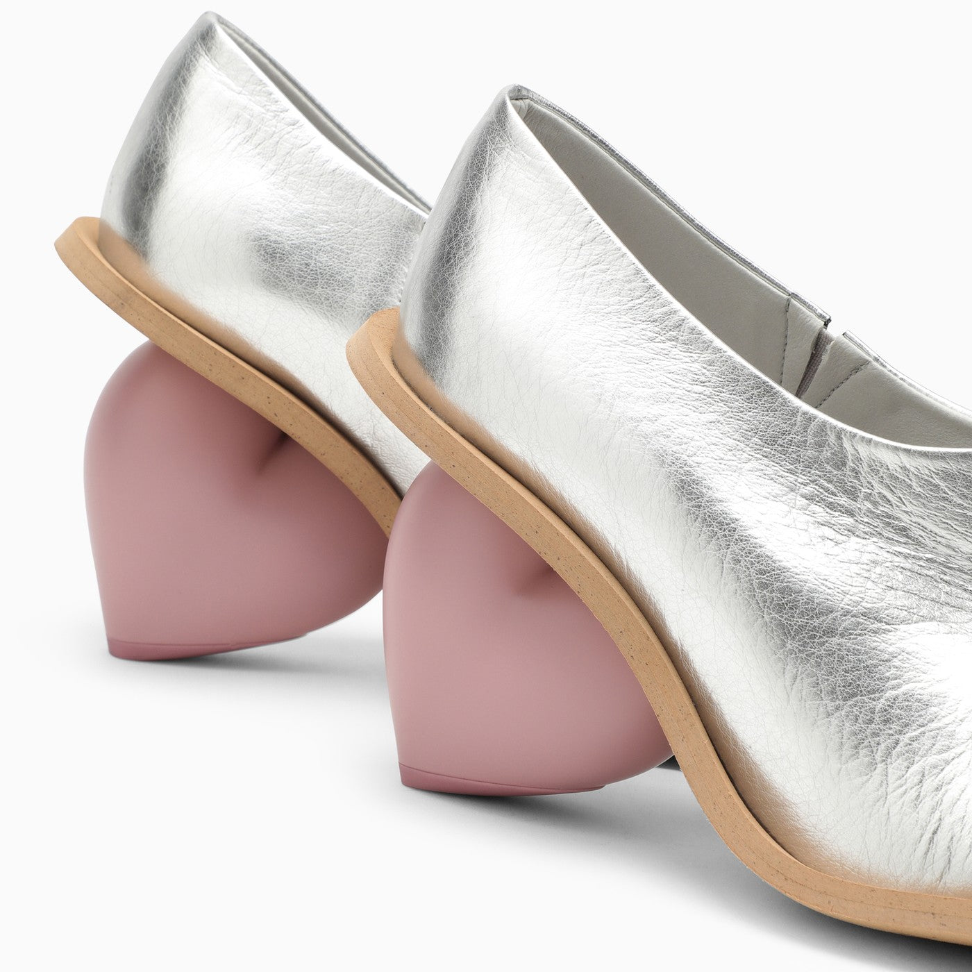 Bota de cuero vegano plateado y rosa de Yume Yume con un talón en forma de corazón y suela de goma.