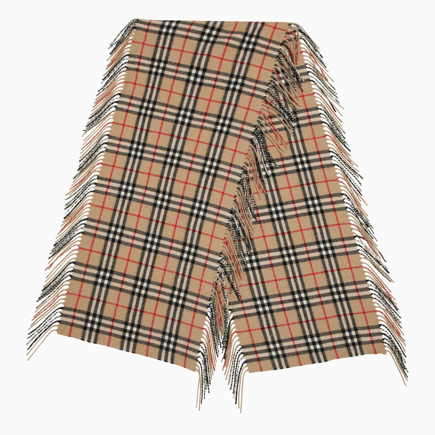 La bufanda de cachemir beige de Burberry presenta un patrón de cheque en todo el mundo y un borde largo con flecos.
