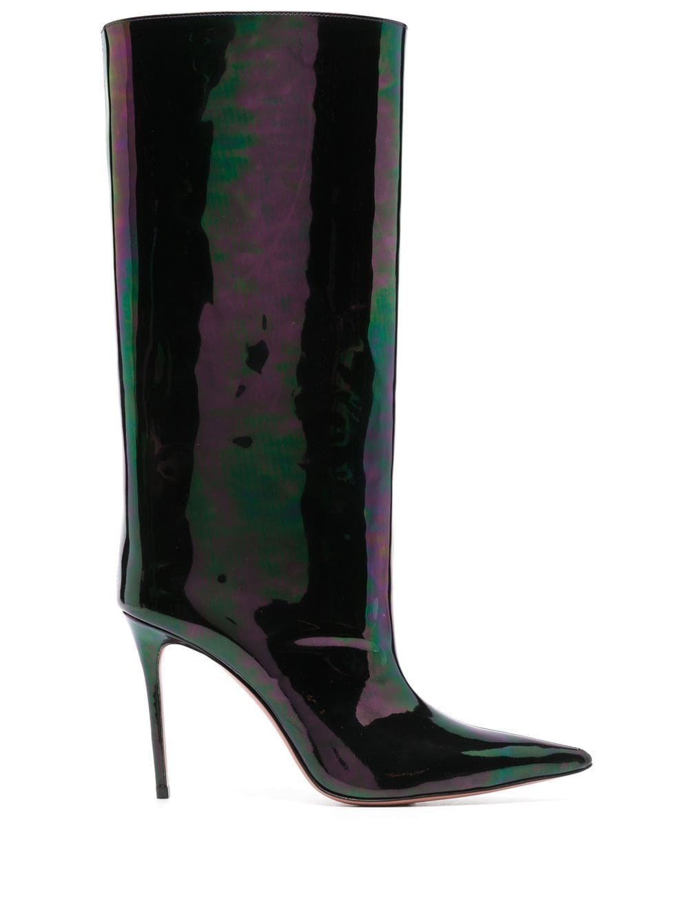 Botas Fiona de 100 mm de Amina Muaddi con negro, cuero de pantorrilla, acabado de patente, efecto iridiscente, dedo del pie puntiagudo y tacón de tacón alto.