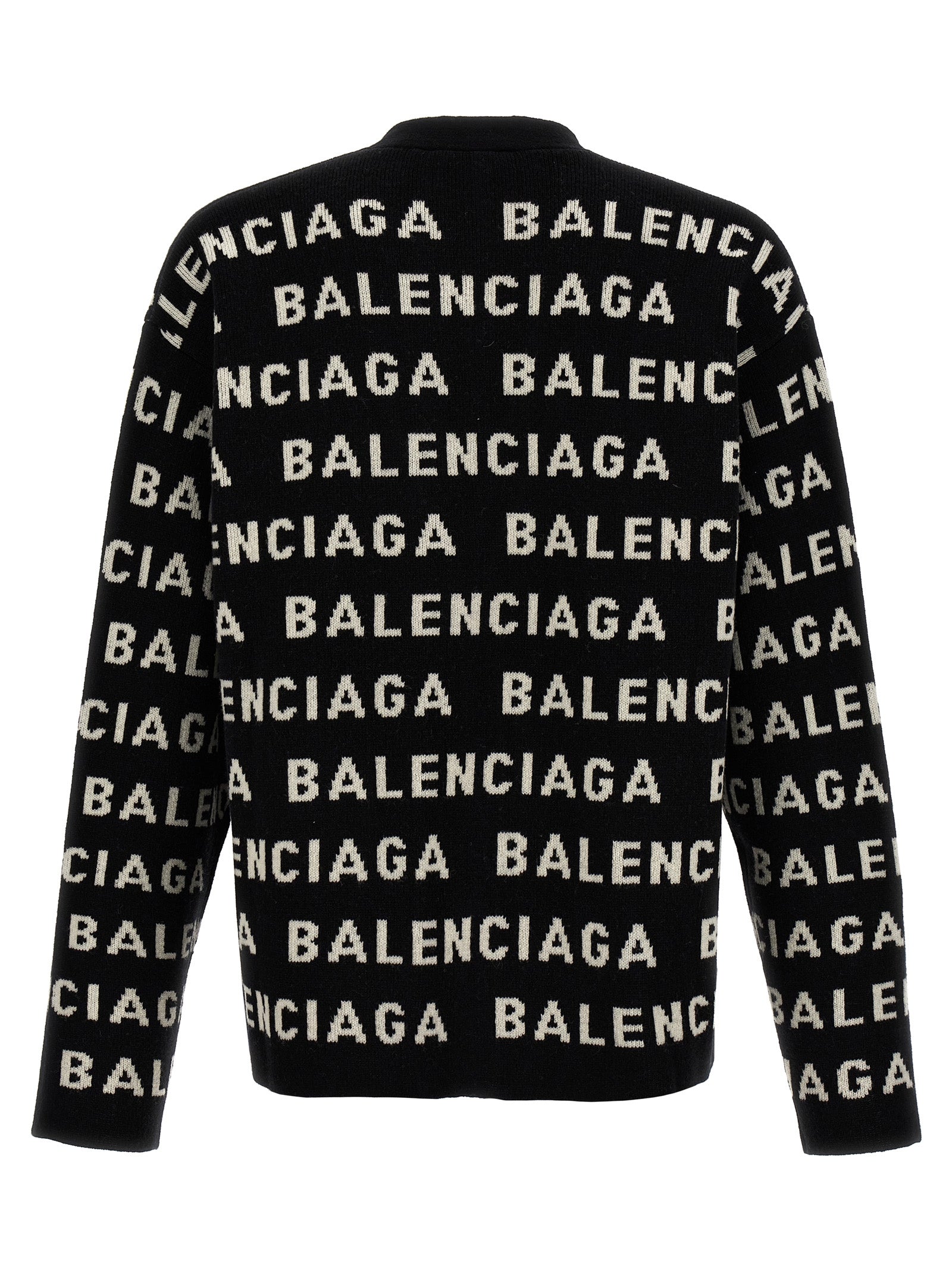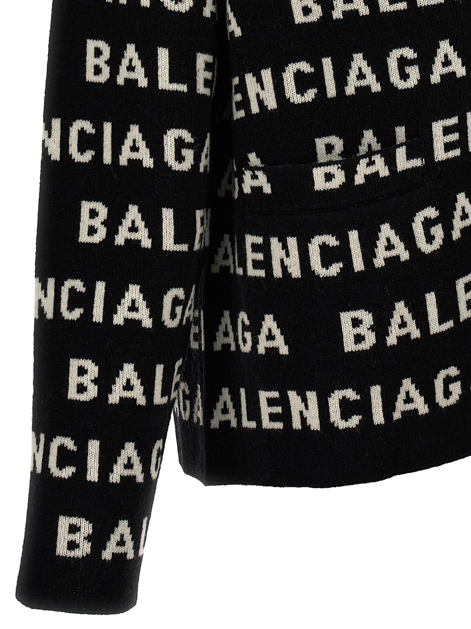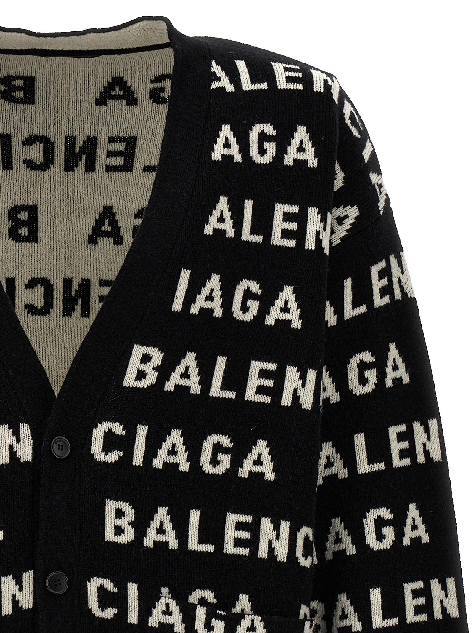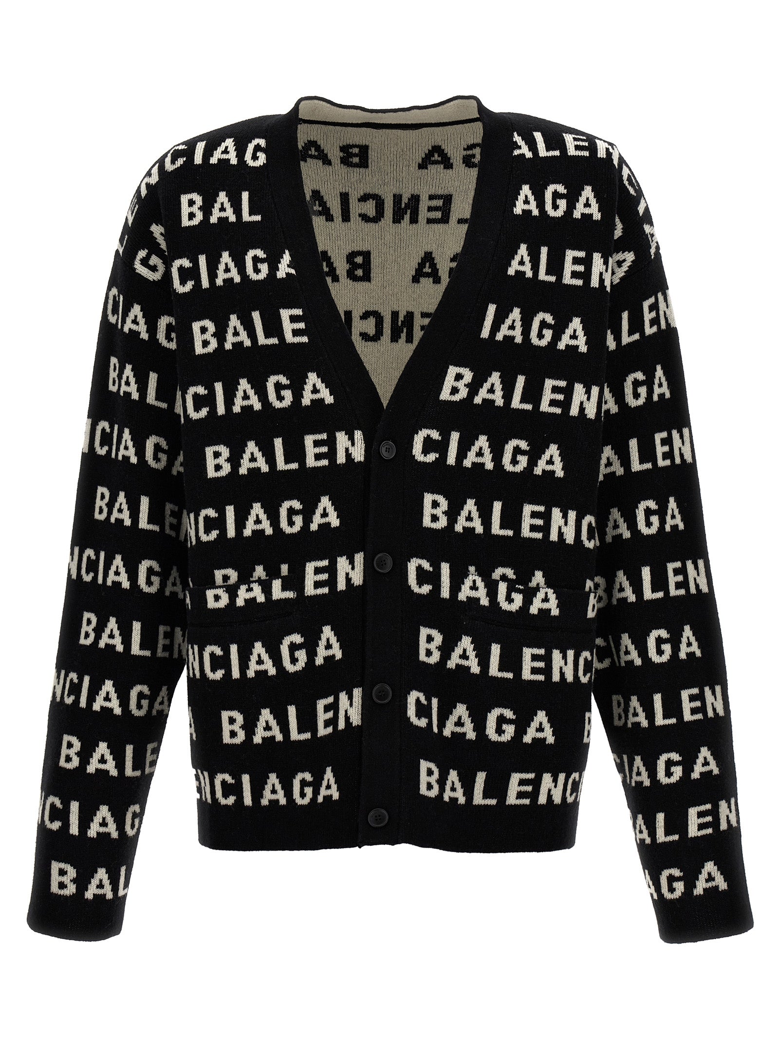 Wool knit cardigan with all-over logo intarsia, button closure, V-neck.