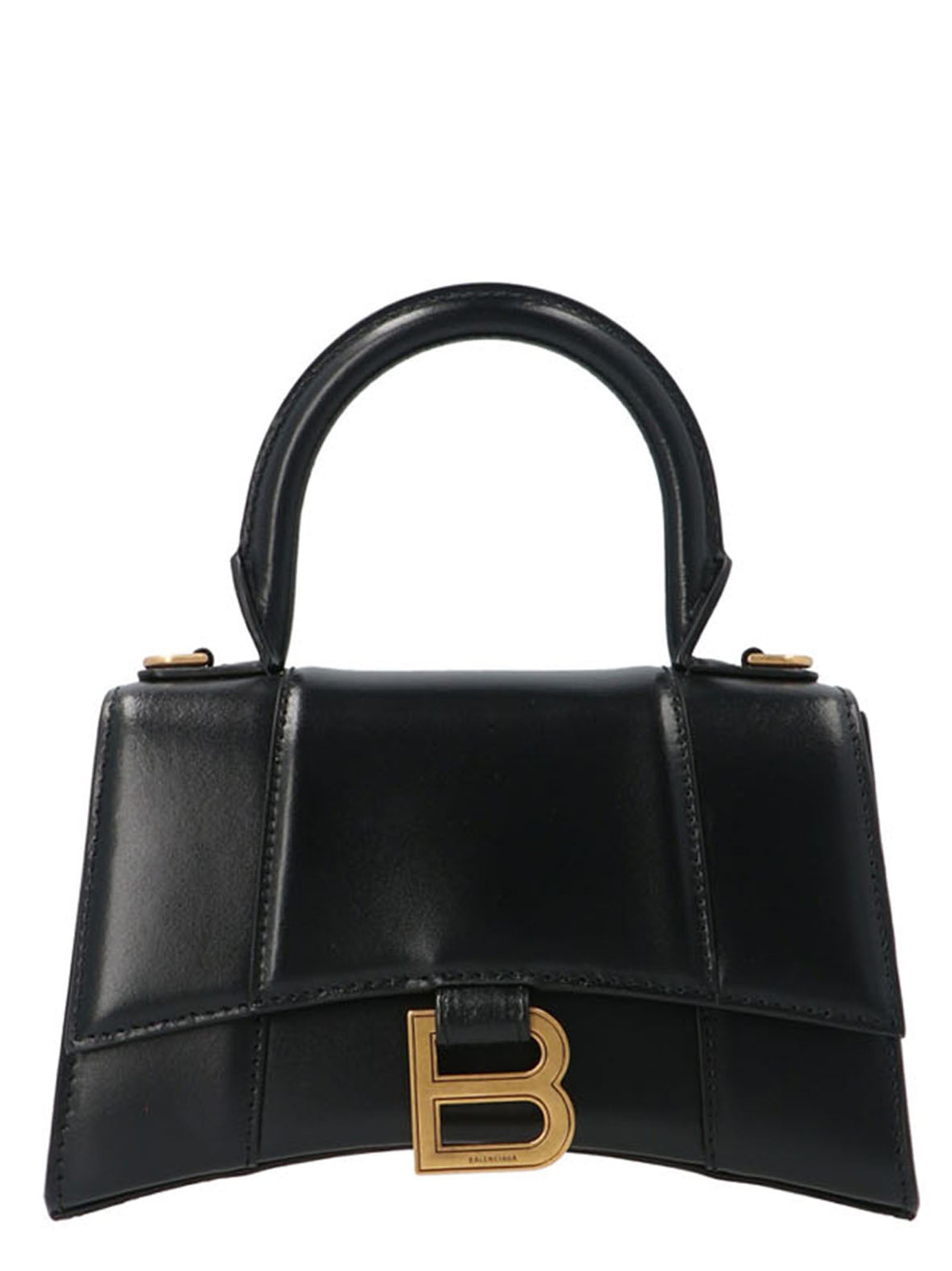 'Reloj de arena XS'bolso con un logotipo de oro metálico' B 'metálico, un mango superior, un cierre de colgajo y una correa para el hombro.