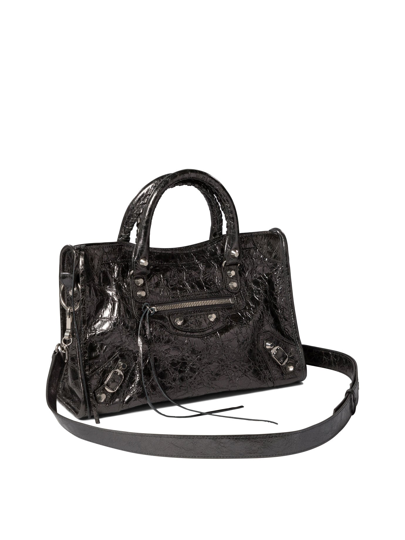 Balenciaga 's "Le City S"El bolso es el accesorio perfecto para la mujer moderna que busca una mezcla de elegancia y funcionalidad. Hecho de cuero de piel de cordero fino, esta bolsa se destaca por su sofisticación y practicidad, ideal para enriquecer cualquier atuendo con un toque de estilo. || - Dimensiones: 30x20x10 cm - Dos manijas de cuero tejidas a mano - Correa de hombro extraíble y ajustable (tramo: 50 cm) - acabado plateado brillante - Cierre de la cremallera y tirador de cuero anudado - bolsillo delantero con cremallera y tirador de cuero anudado - Pocket de la cremallera interior - forro de lona de algodón || Para un aspecto completo y elegante, combine esta bolsa con una gabardina beige y un par de bombas negras. Para un estado de ánimo más informal, opte por los jeans de cigarrillos y una blusa blanca.