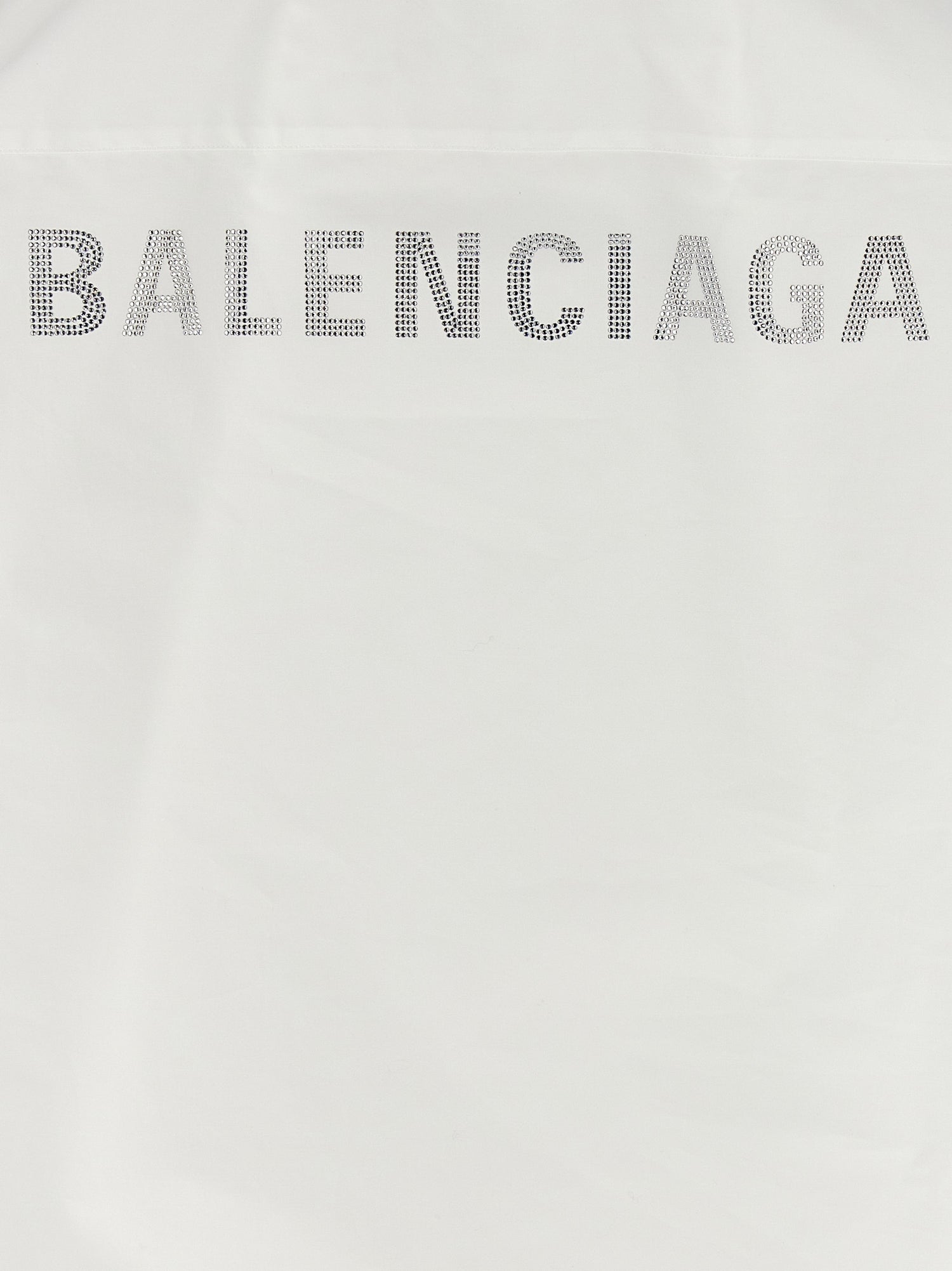 Camisa de algodón Poplin con logotipo de diamantes de imitación en la parte posterior, bolsillo delantero, cierre de botones, mangas largas con espinillas.
