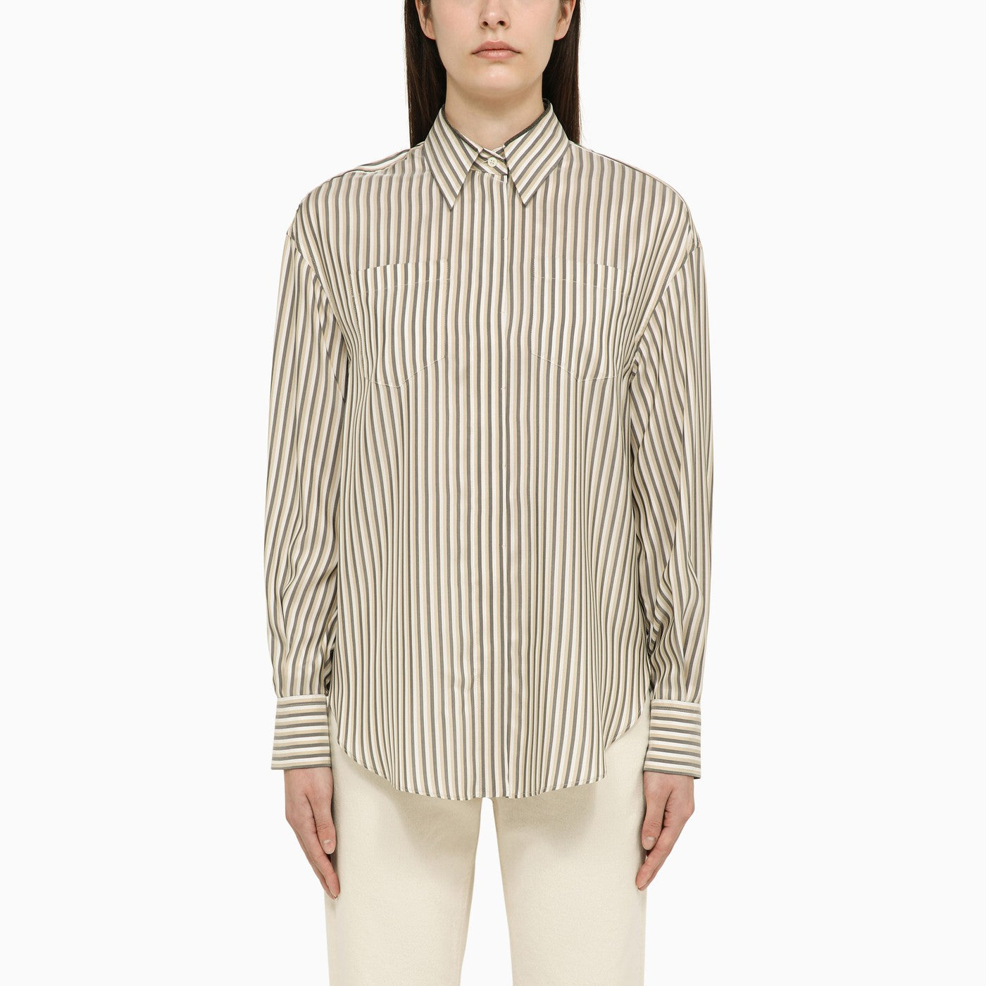 Camisa de seda a rayas blanca, beige y lignito de Brunello Cucinelli con un cuello puntiagudo con detalles con cuentas, mangas largas con puños abotonados, un abastecimiento de botón frontal oculto y dos bolsillos de parche en el cofre.