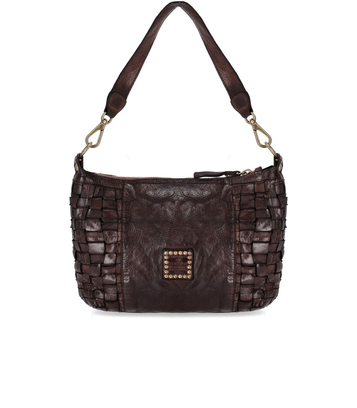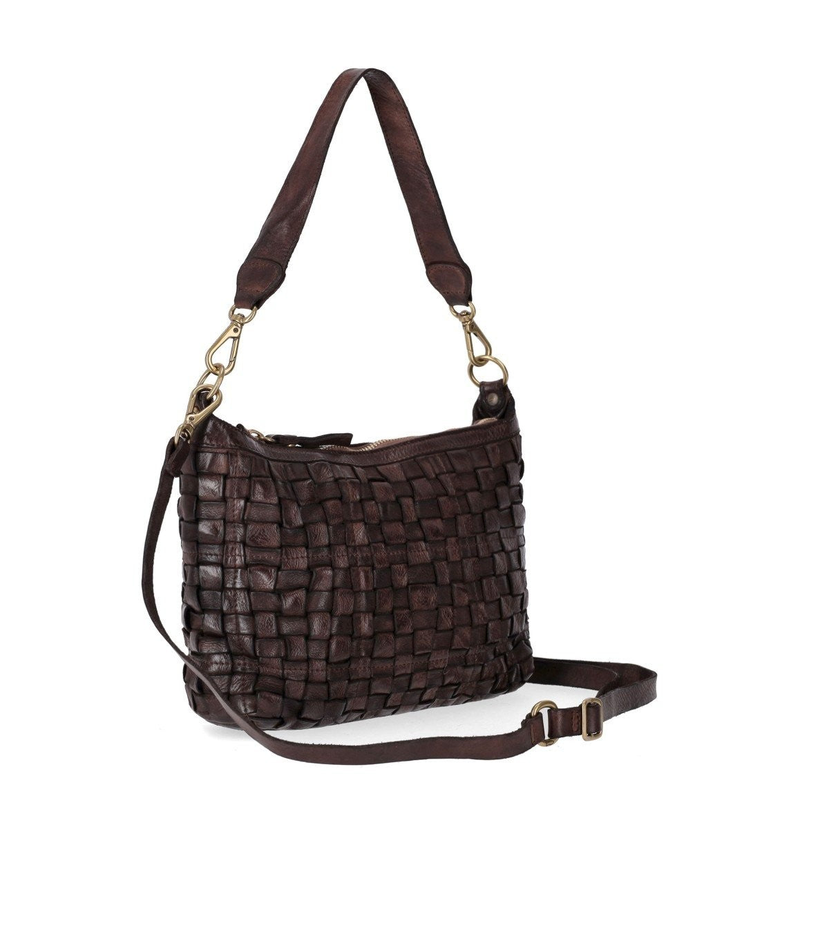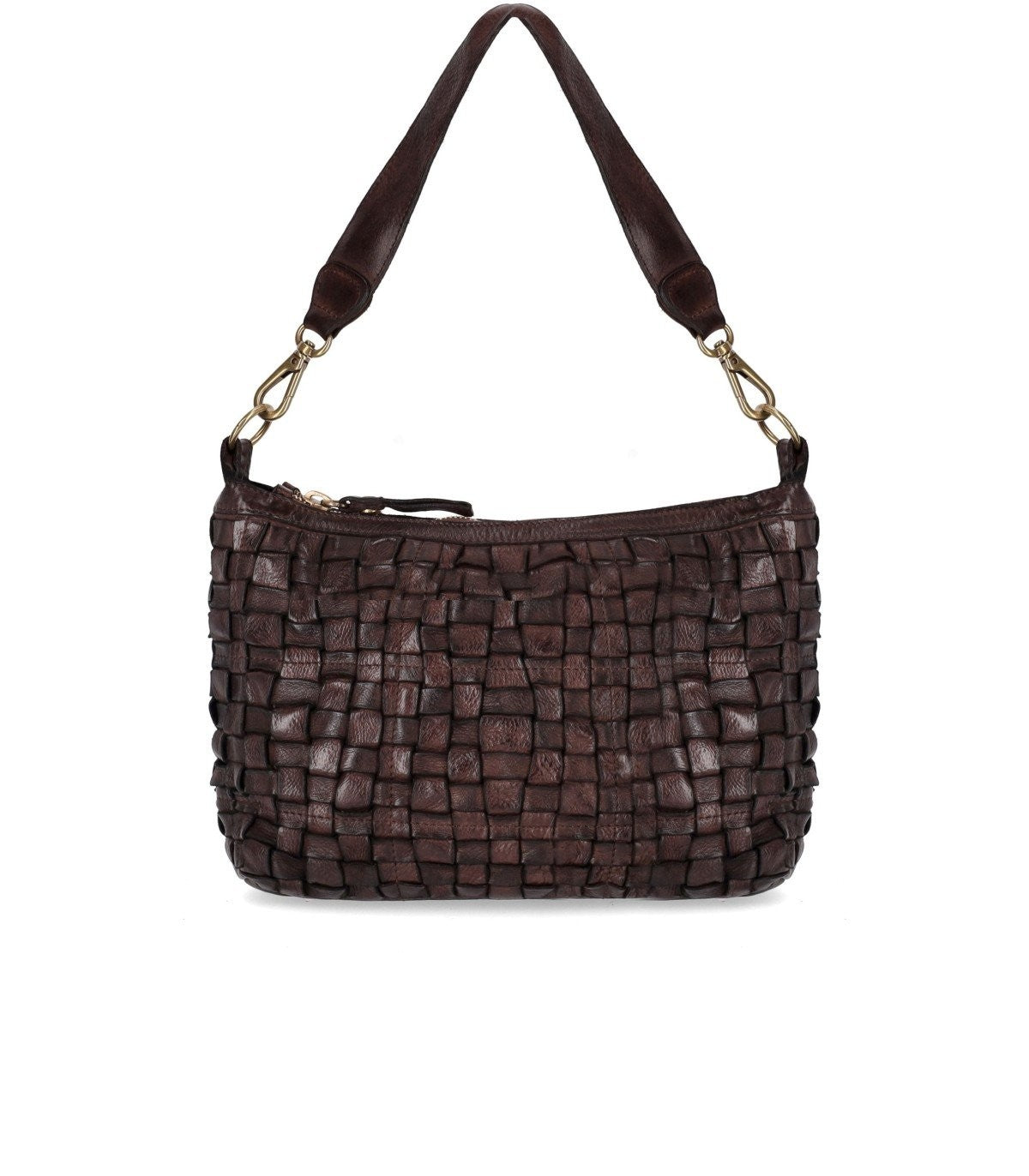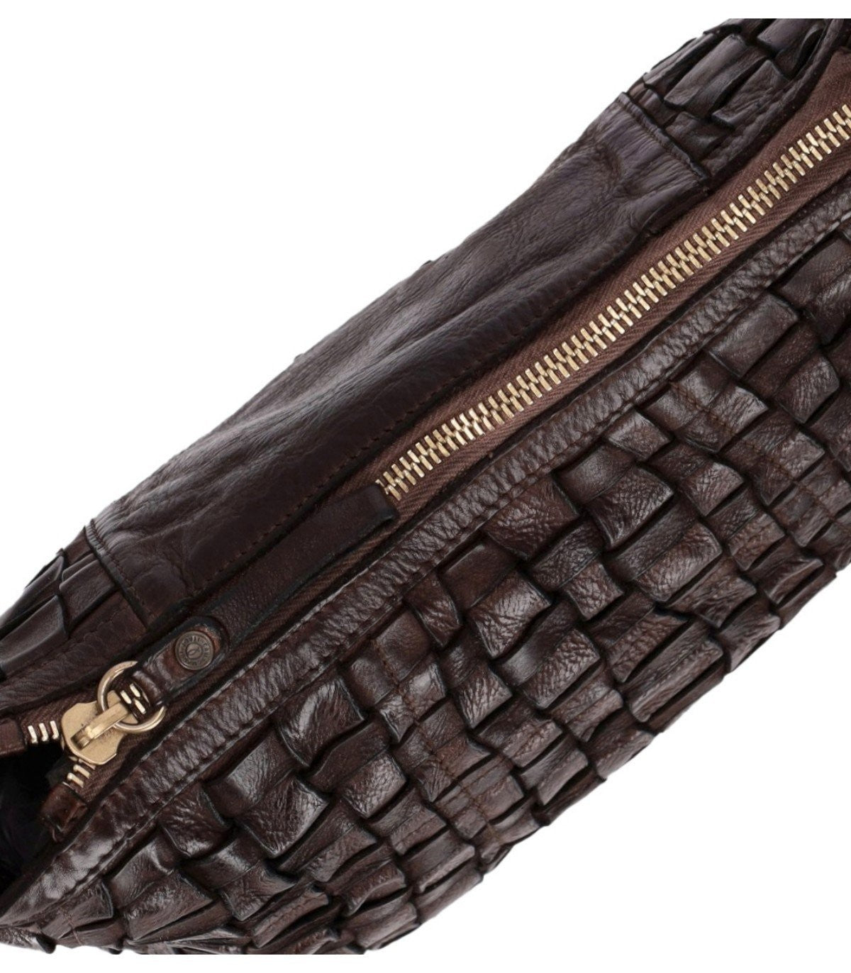 Bolsa de compras Campomaggi hecha de cuero de piel de vaca en color marrón oscuro. Caracterizado por una decoración tejida, presenta un cierre de cremallera terminado con metalware dorado. Interior forrado con un bolsillo con cremallera. Equipado con un bolsillo pequeño para un teléfono móvil y una correa de hombro extraíble. Dimensiones 36x23x11 cm.