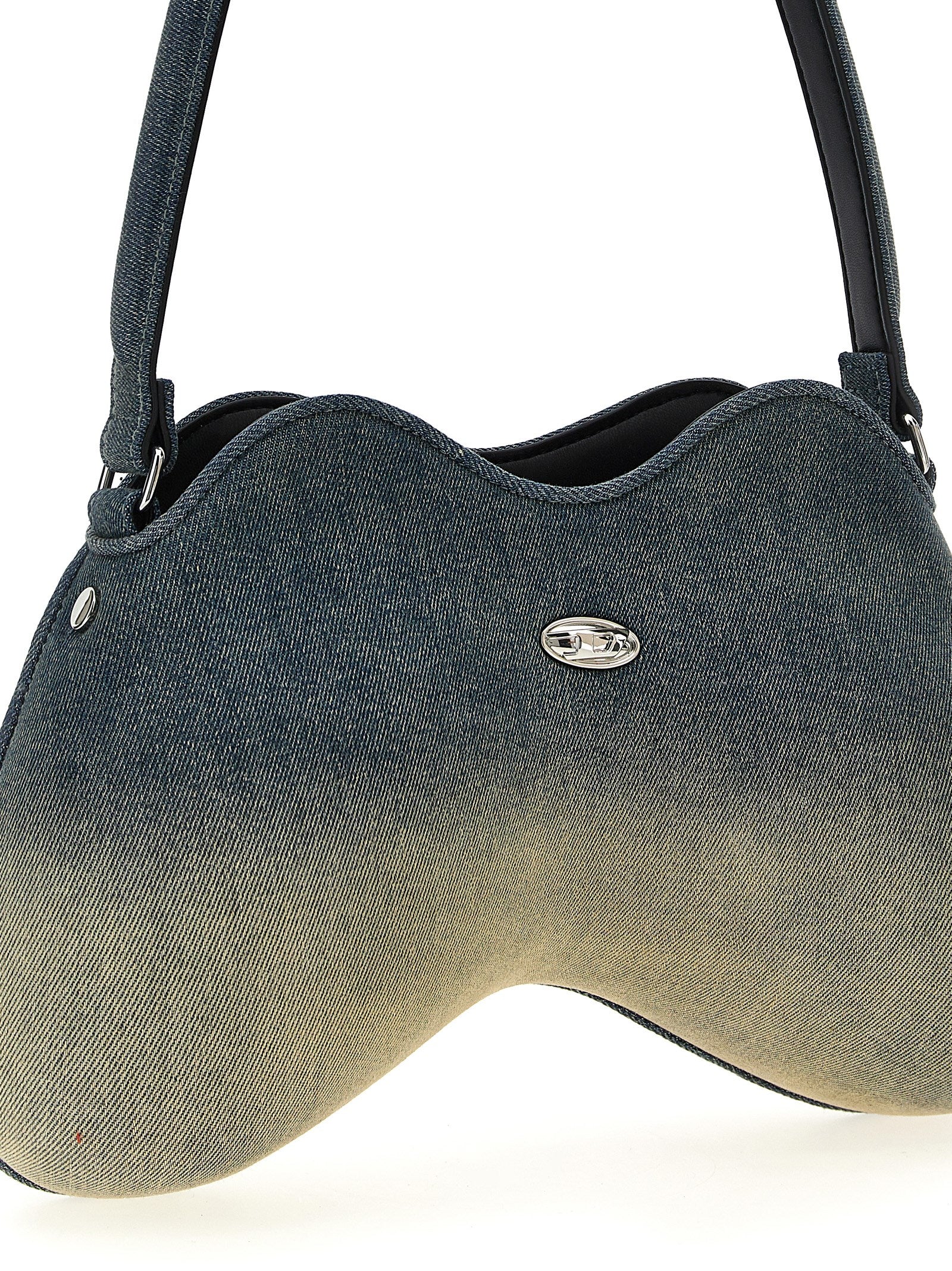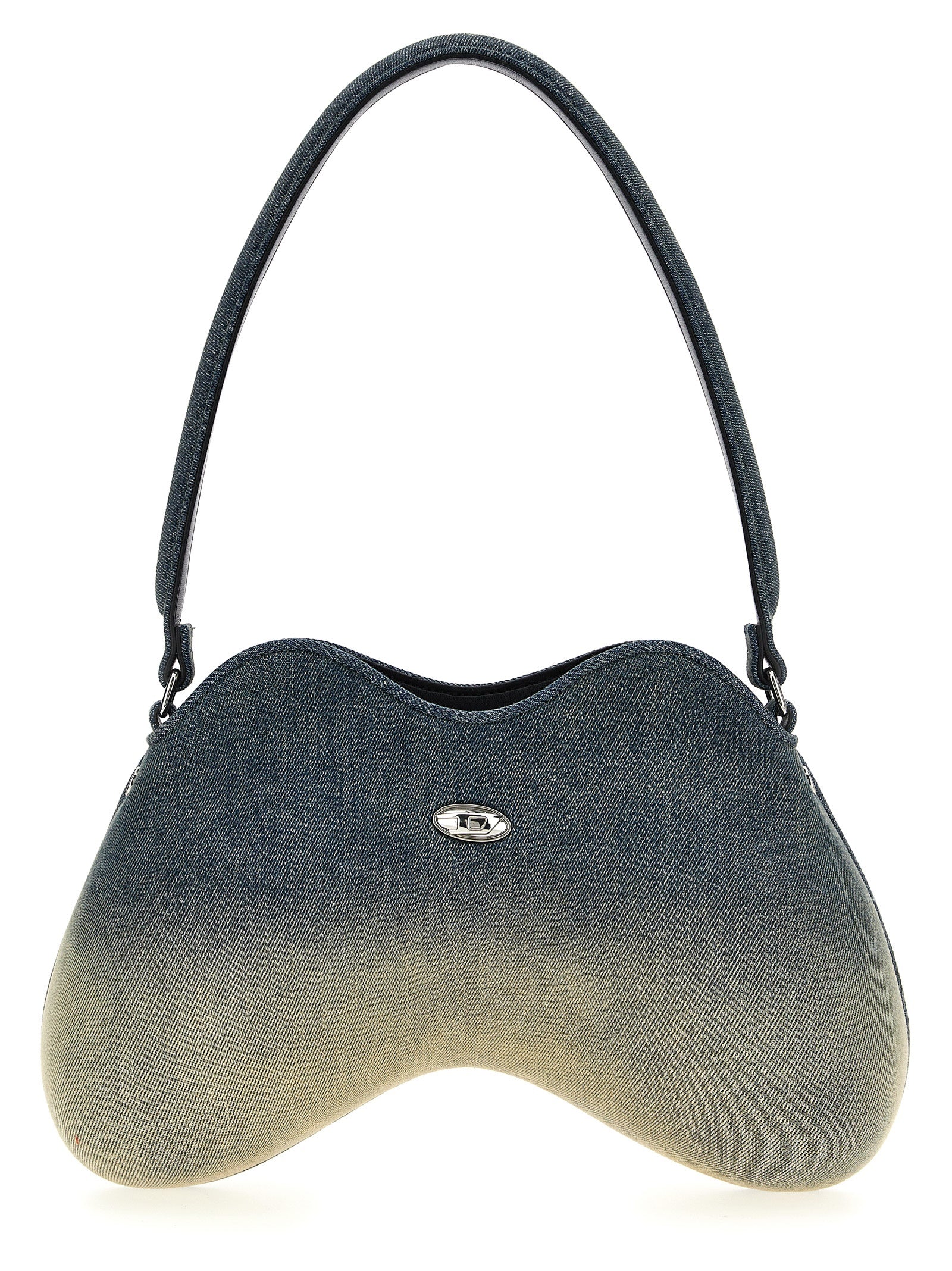 Bolsa de hombro 'Doble-D' en mezclilla azul solarizada con construcción escultórica rígida, logotipo de metal delantero, mango fijo, cierre de cremallera.