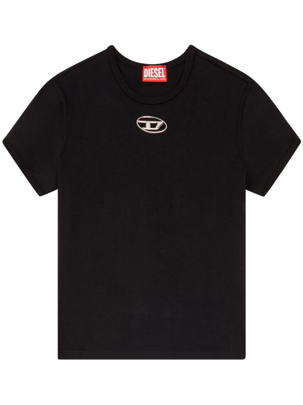 placa de tono plateado de algodón negro placa cuello redondo mangas cortas dobladillo recto