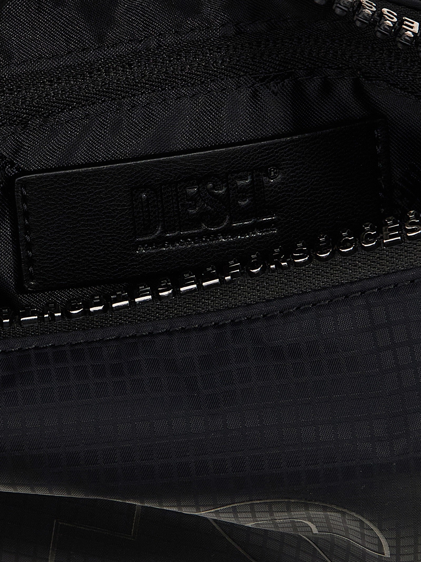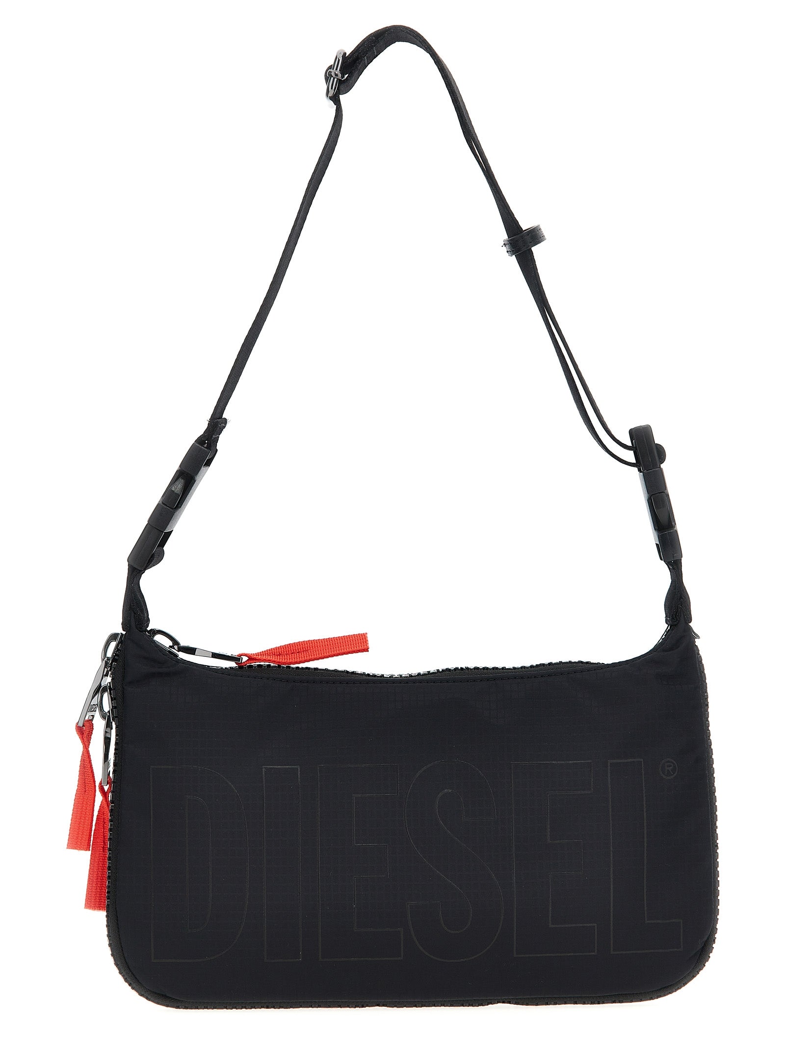Bolsa de hombro de nylon Zip-D con estampado del logotipo delantero, cierre de cremallera, aplicación en la parte inferior, correa de hombro ajustable.