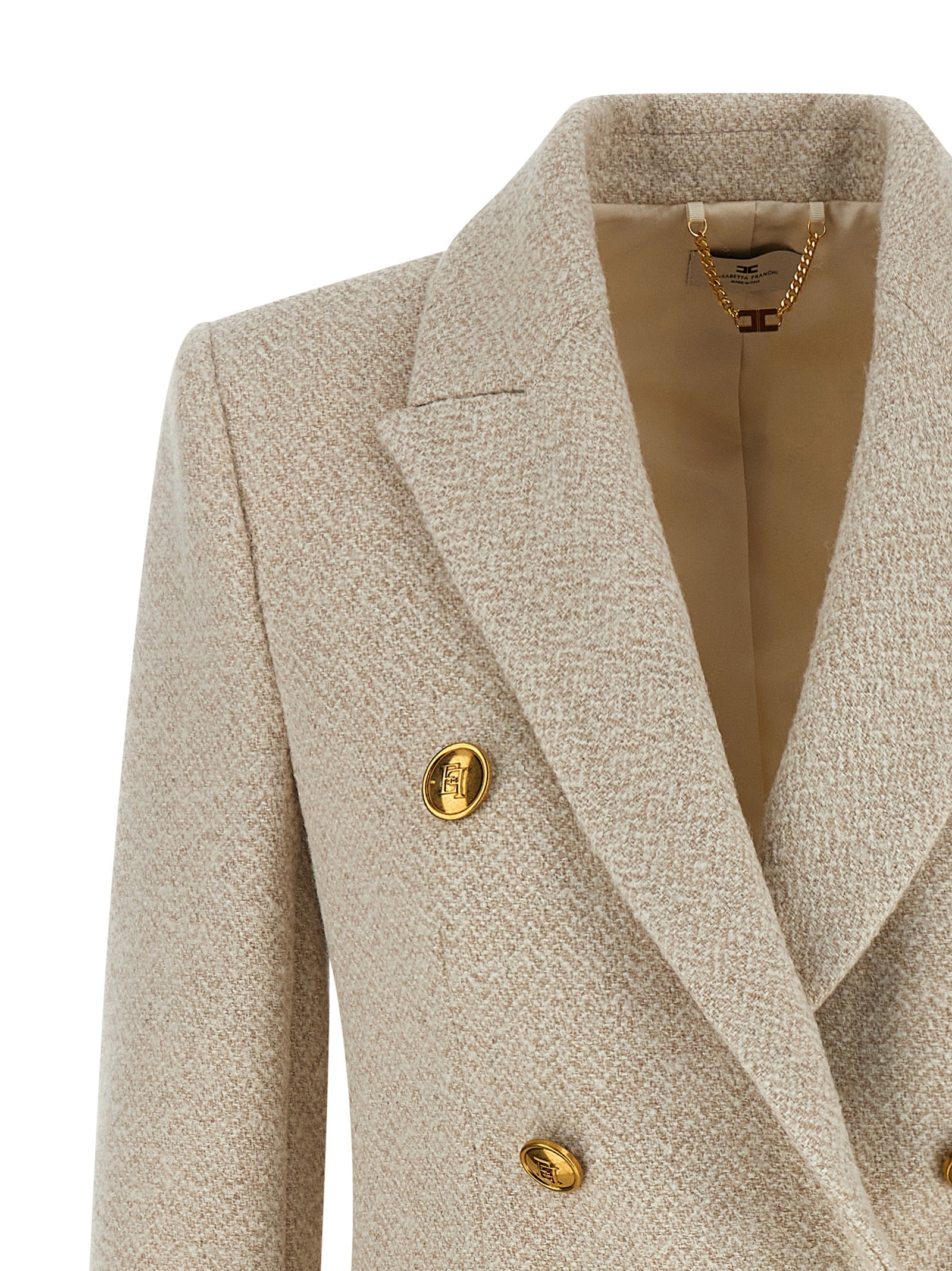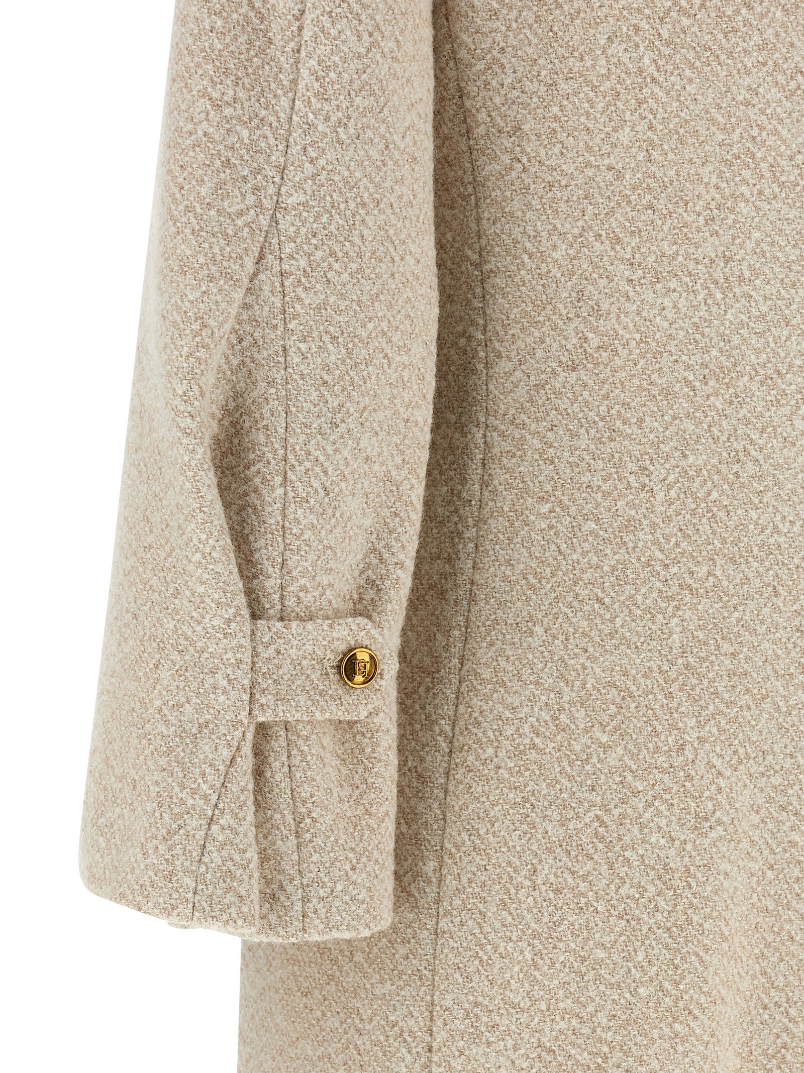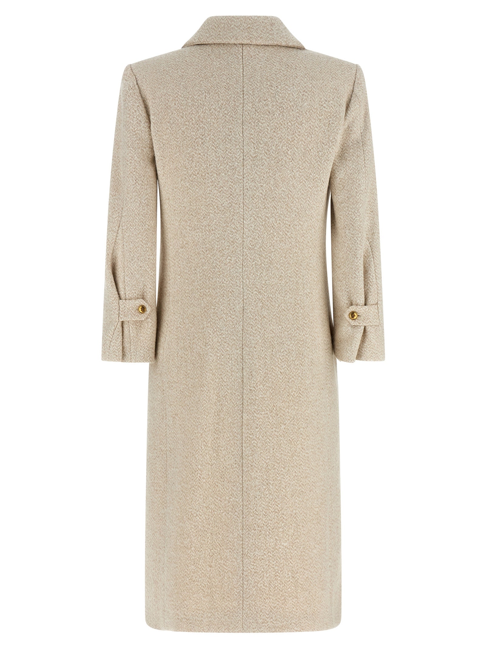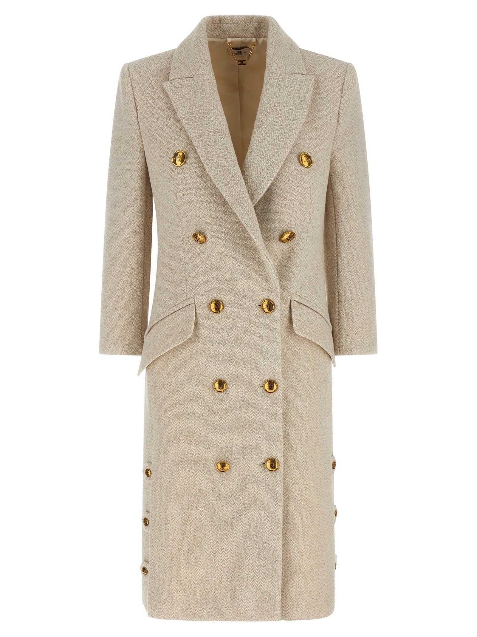 Double-breasted long coat with metal buttons, V-shaped scllo with lapels, button detail in the side slits, pockets, lunch sleeves with adjustable cuffs