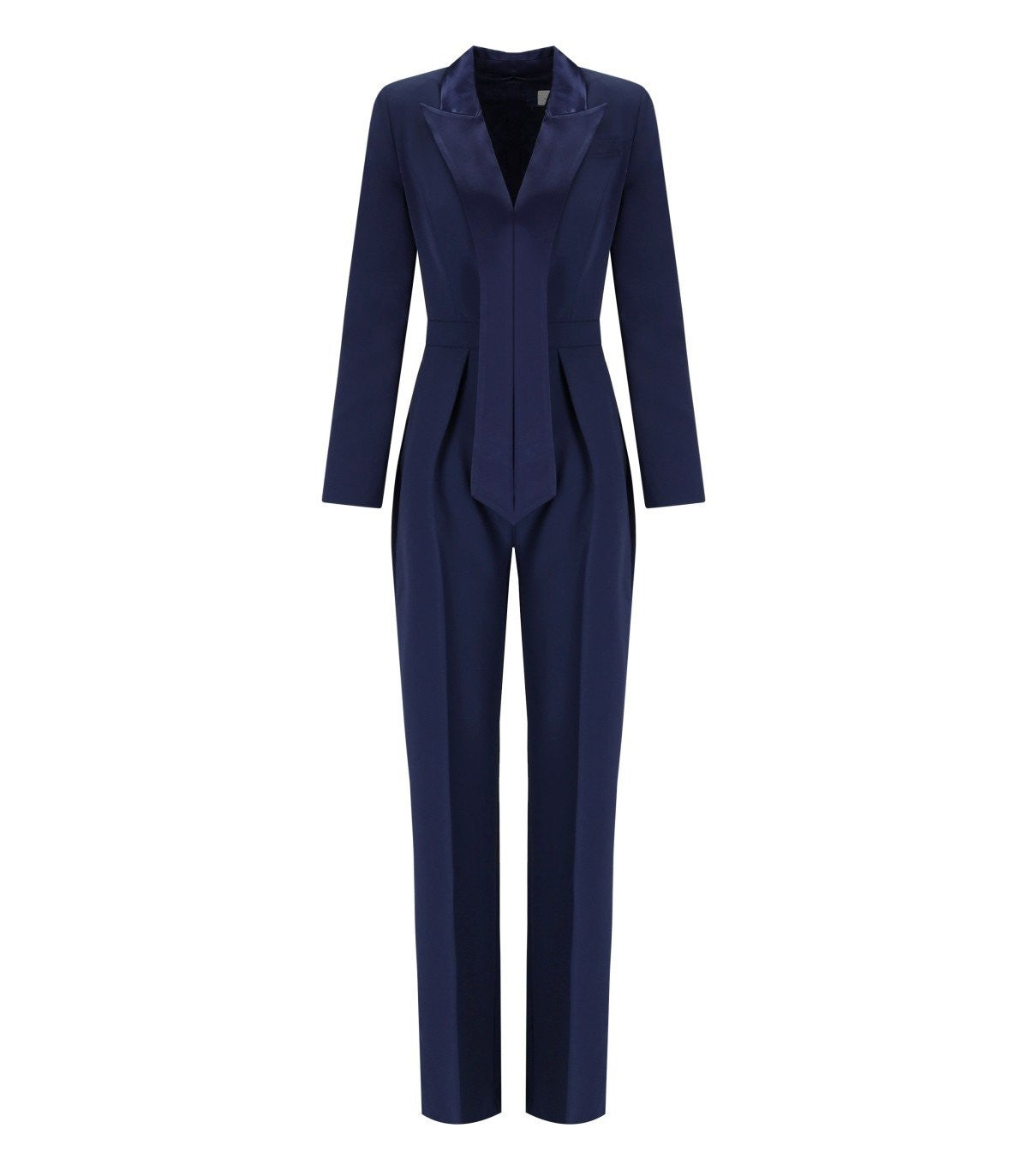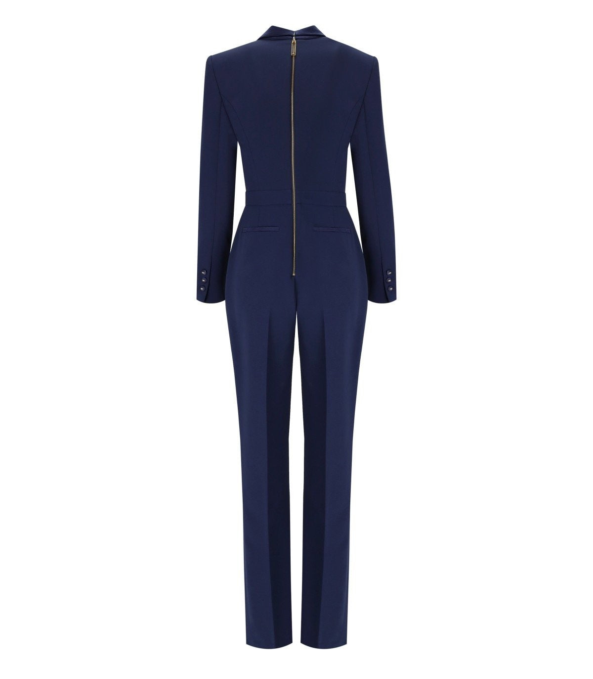 Elisabetta franchi smoking hecha de crepe liviano en tonos azul oscuro. Caracterizado por correas de hombro acolchadas, presenta un cierre de cremallera con un logotipo de metal dorado en la parte posterior y mangas largas con botones cubiertos de tela. Alineado internamente en satén de monograma, tiene solapas de satén terminadas en satén brillante que recrean el efecto de una pequeña bufanda y detalles coordinados. Fit delgado. Composición: 95% de poliéster, 5% de elastano.