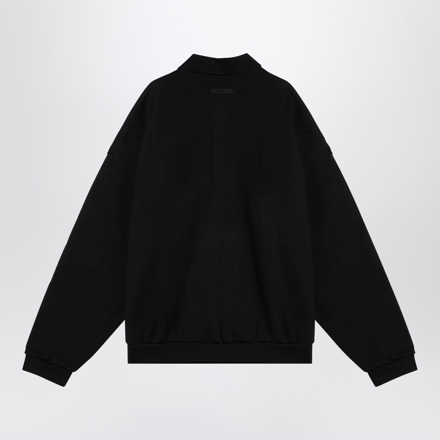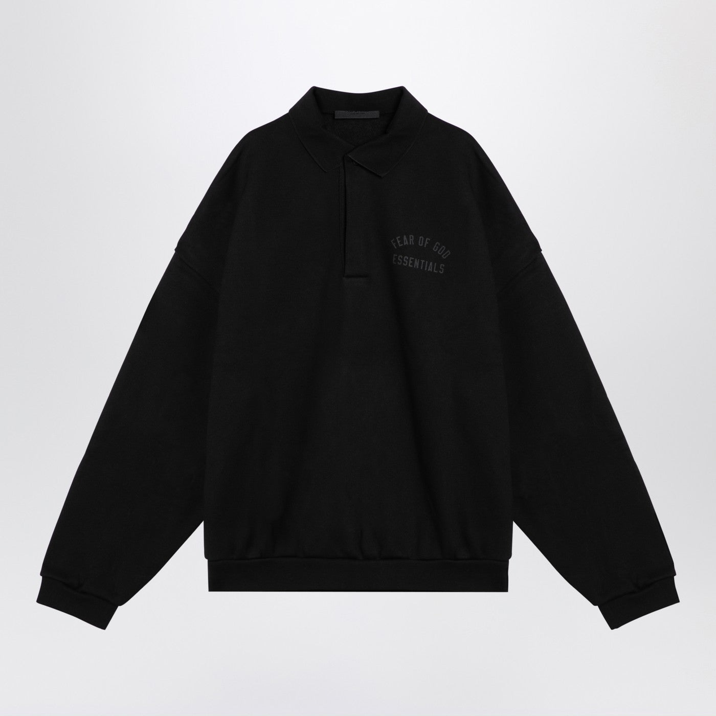 Black heavy cotton blend polo shirt by Fear Of God Essentials, featuring long sleeves, front buttons and lettering logo on chest.