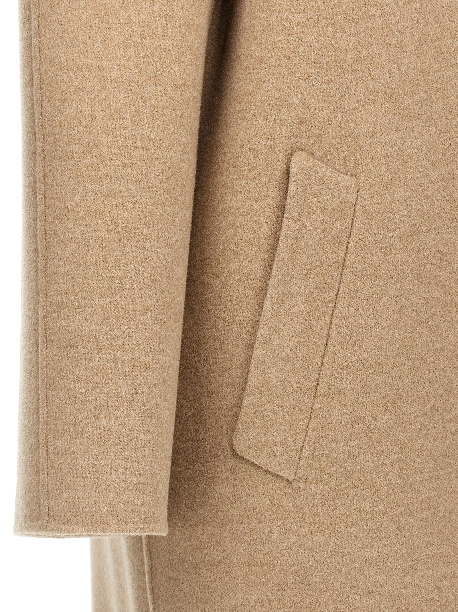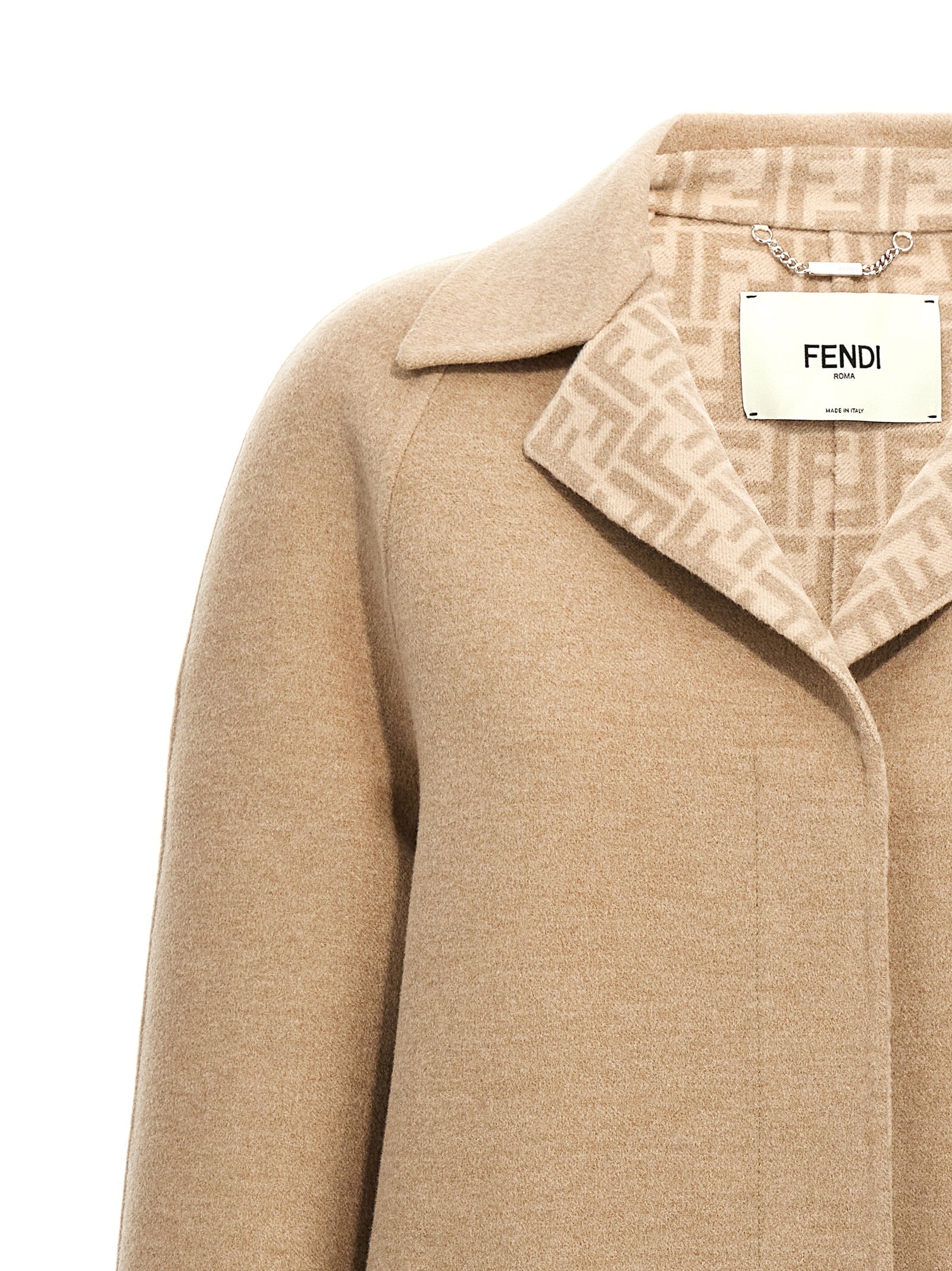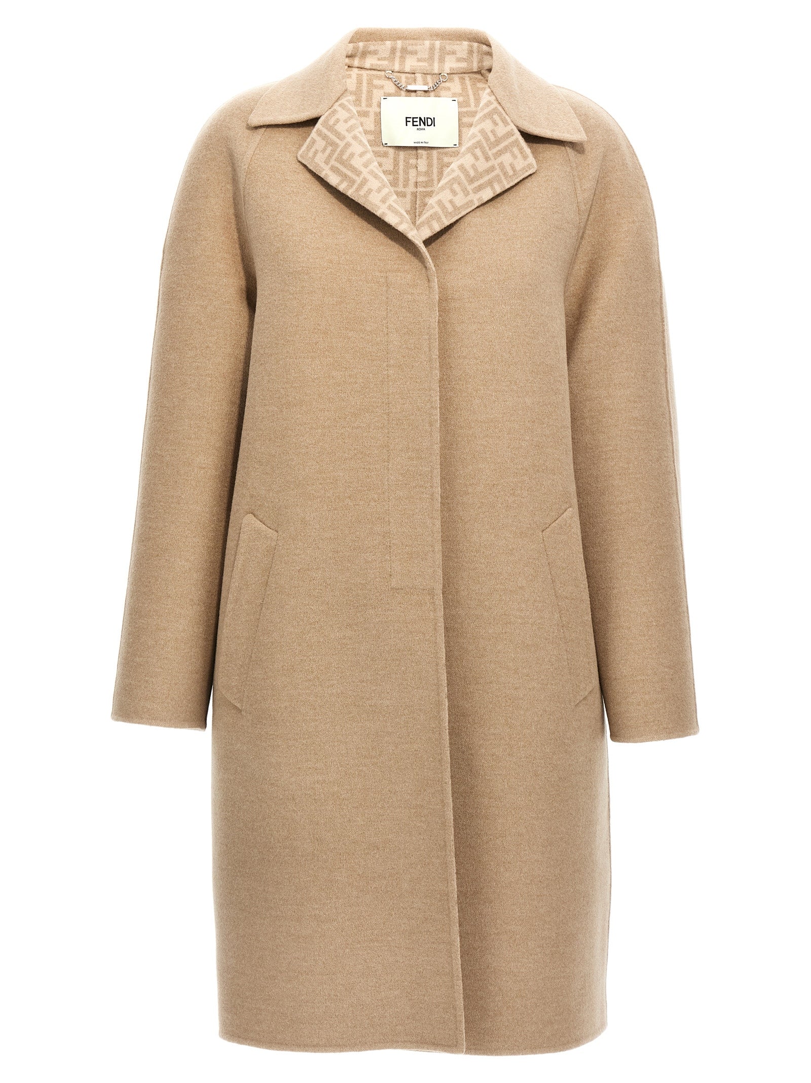 Single-breasted solid wool coat with 'FF' print lining, button closure, pockets, long sleeves, and back split.