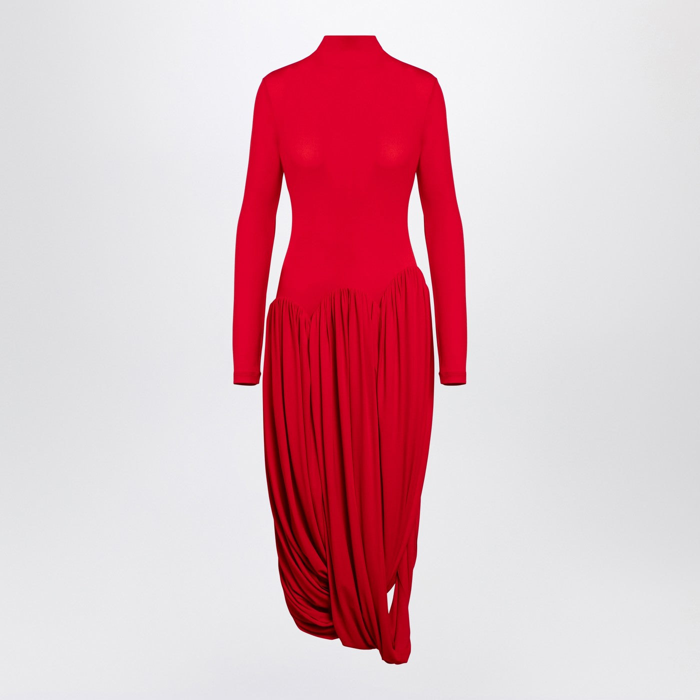 Vestido de jersey de viscosa roja de Ferragamo con un collar alto, mangas largas, un corpiño ajustado, una falda tulipanada amplia, una hendidura lateral y una cremallera trasera.