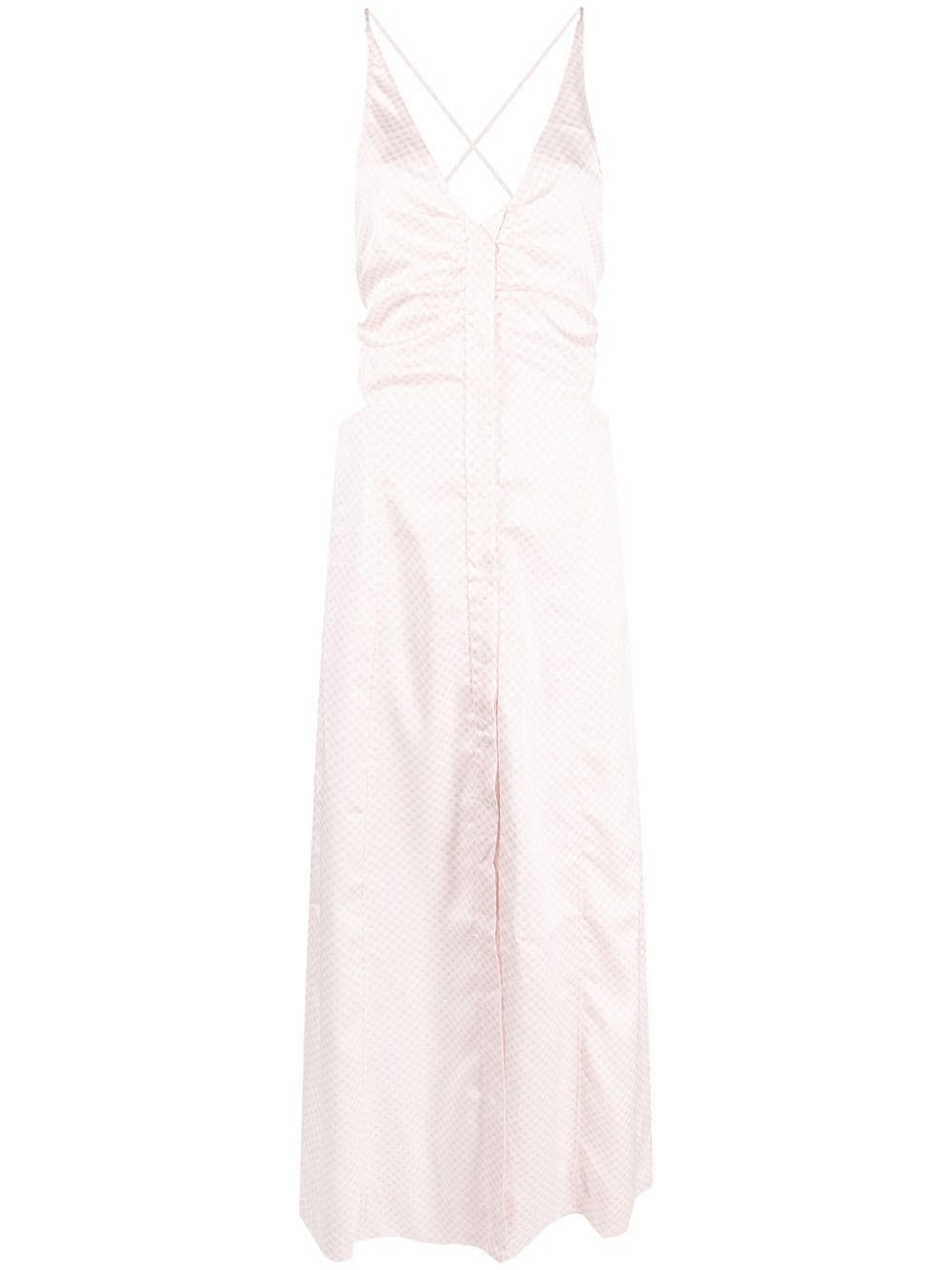 Vestido recortado al alquiler de Ganni con rosa claro, poliéster reciclado, patrón de verificación de gingham, detalles ruchados, fijación del botón delantero, halcecadro y tobillo hasta el tobillo. Consciente: este artículo está hecho de al menos 50% de materiales reciclados o reciclados. Para los productos de ropa sintética reciclada, recomendamos encarecidamente usar una bolsa de lavado de microfibra para garantizar que no se liberen microplásticos que puedan contaminar agua en el proceso.