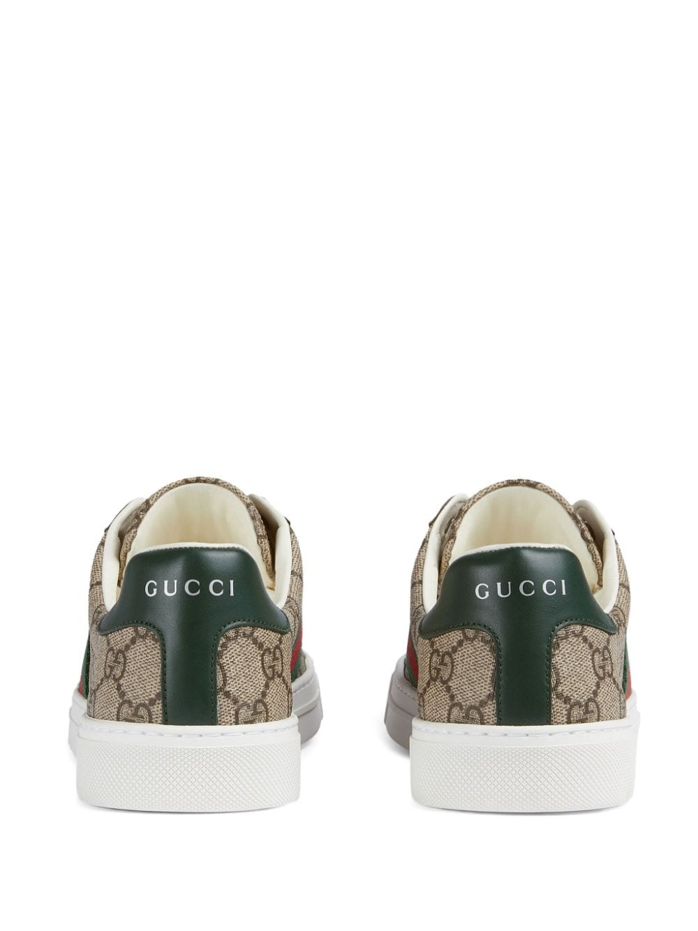 Ace GG Supreme Leather Sneakers de Gucci con beige, verde oscuro, lienzo Supreme GG, detalles web de firma, estampado de logotipo en la parte trasera, fijación de cordones delanteros, plantilla de cuero de marca y suela de goma. Mujer's Las zapatillas de deporte Gucci se ajustan grandes. Para el ajuste más cómodo, seleccione la mitad de un tamaño.