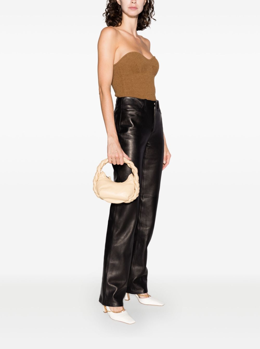 Bolsa de cuerpo de cuero de mini espiga de Hereu con tope, cuero de pantorrilla, textura de grano, forro de algodón, manija superior trenzada, correa de hombro desmontable, sujetación con cremallera superior y etiqueta de logotipo interna.