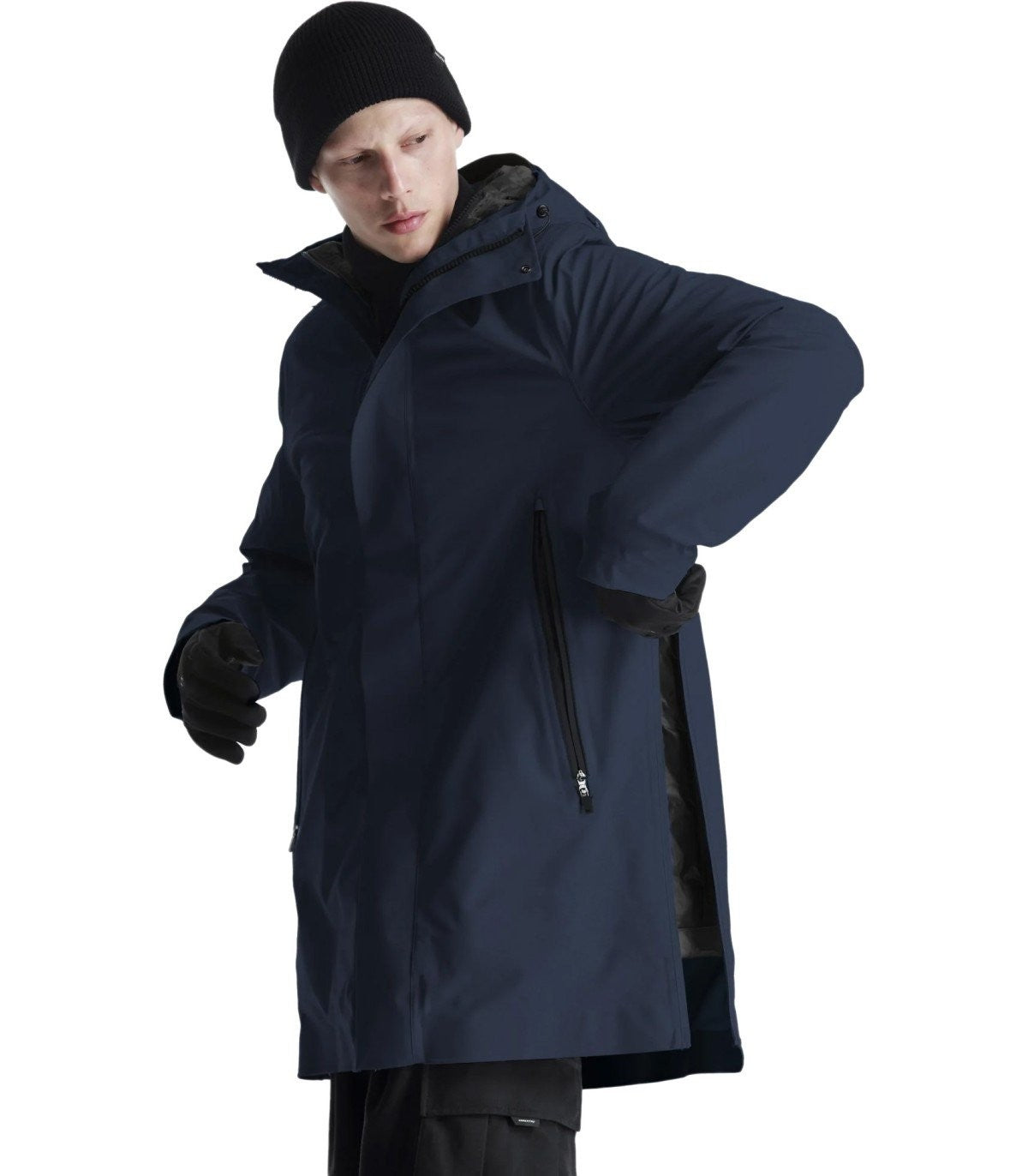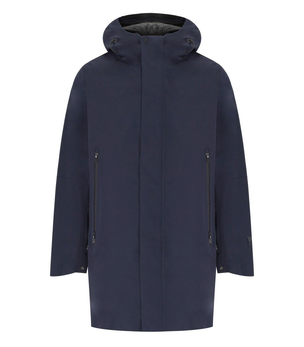 Planck Liner parka by Krakatau made of matte nylon fabric, laminated with waterproof membrane, in navy blue. Characterized by a front double-slider zipper closure and windproof flap with magnets and snaps, it features a deep adjustable hood with zipper, drawstring at the back, and a visor that maintains its shape. In the front, it has zippered pockets. Equipped with long sleeves, adjustable cuffs, and a smart pocket on the sleeve. It includes a detachable inner jacket lined with quilted pattern, which can be worn as a separate piece. Zippered side vents. Regular fit. Composition: 85% nylon, 15% spandex.