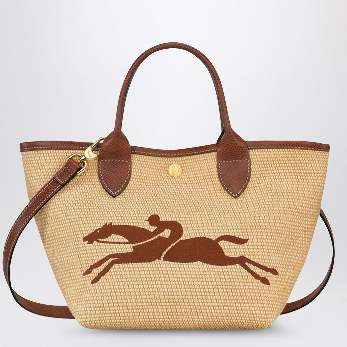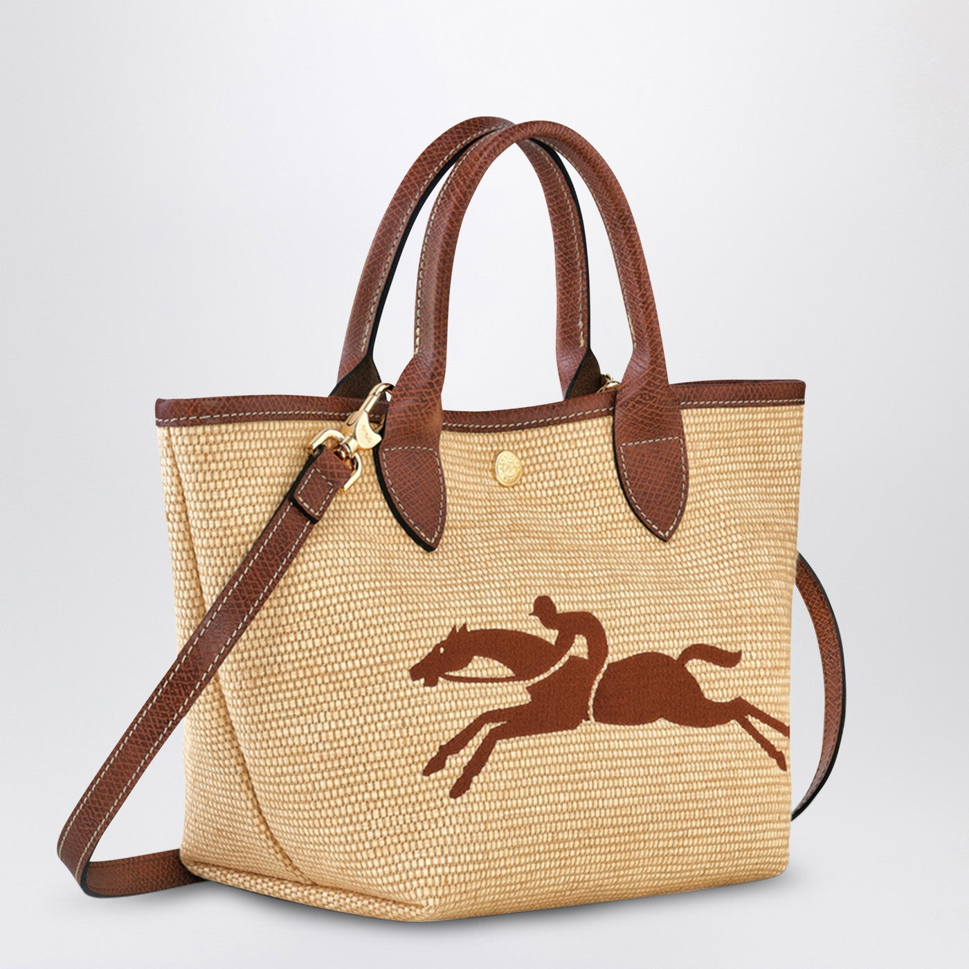 Bolsa en tela de efecto de paja beige por Longchamp, cubierta de papel con detalles marrones contrastantes, dos manijas superiores y correa de hombro de tono en tonos extraíbles.