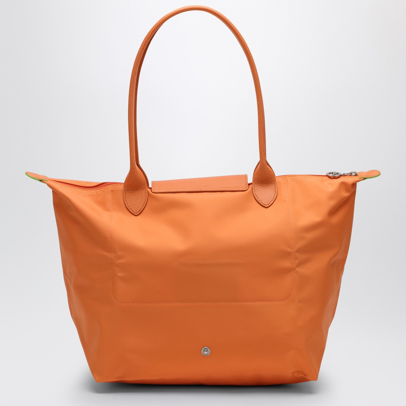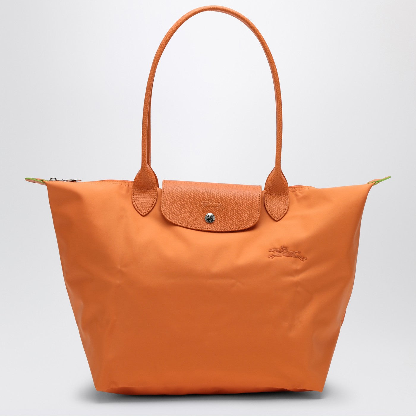 Bolso de hombro grande de Longchamp en tela reciclada naranja, con dos manijas de tono en tono y detalles de cuero. Modelo plegable.